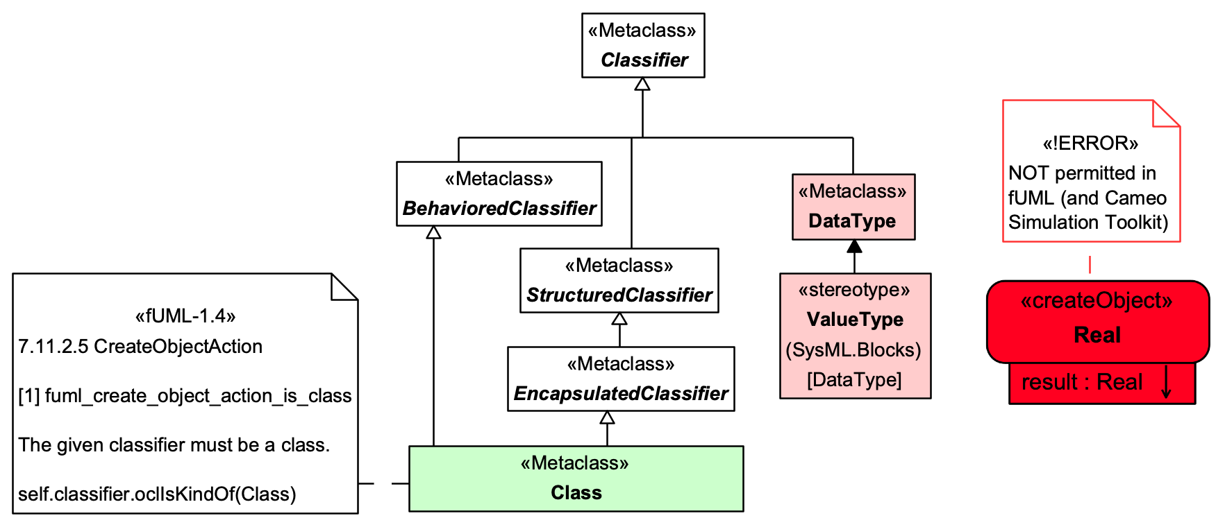In fUML-1.3/1.4 - and Magic Model Analyst® (Cameo Simulation Toolkit®)) - CreateObjectAction is not allowed to instantiate a UML DataType or a SysMLValueType, only a Class as the < code>CreateObjectAction::classifier: