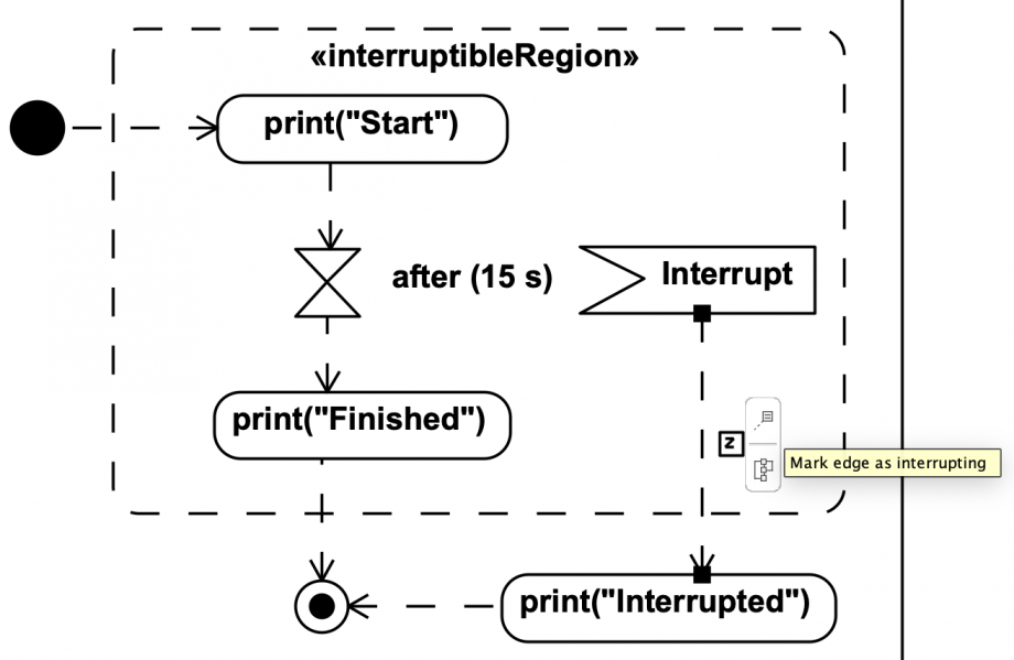 Please note that whilst 'InterruptibleRegion' is referenced in UML-2.5.1 and fUML-1.4, there is no metaclass InterruptibleRegion. Visit also InterruptibleActivityRegion.