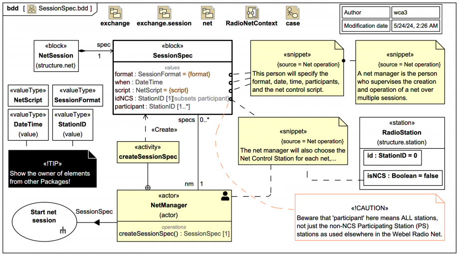 A quick form of the Webel Parsing Analysis recipe for SysML was used to elicit some model elements from some text extracts of the Wikipedia Net Operation article via Webel «snippet» ElementGroups, including value properties for the SessionSpec