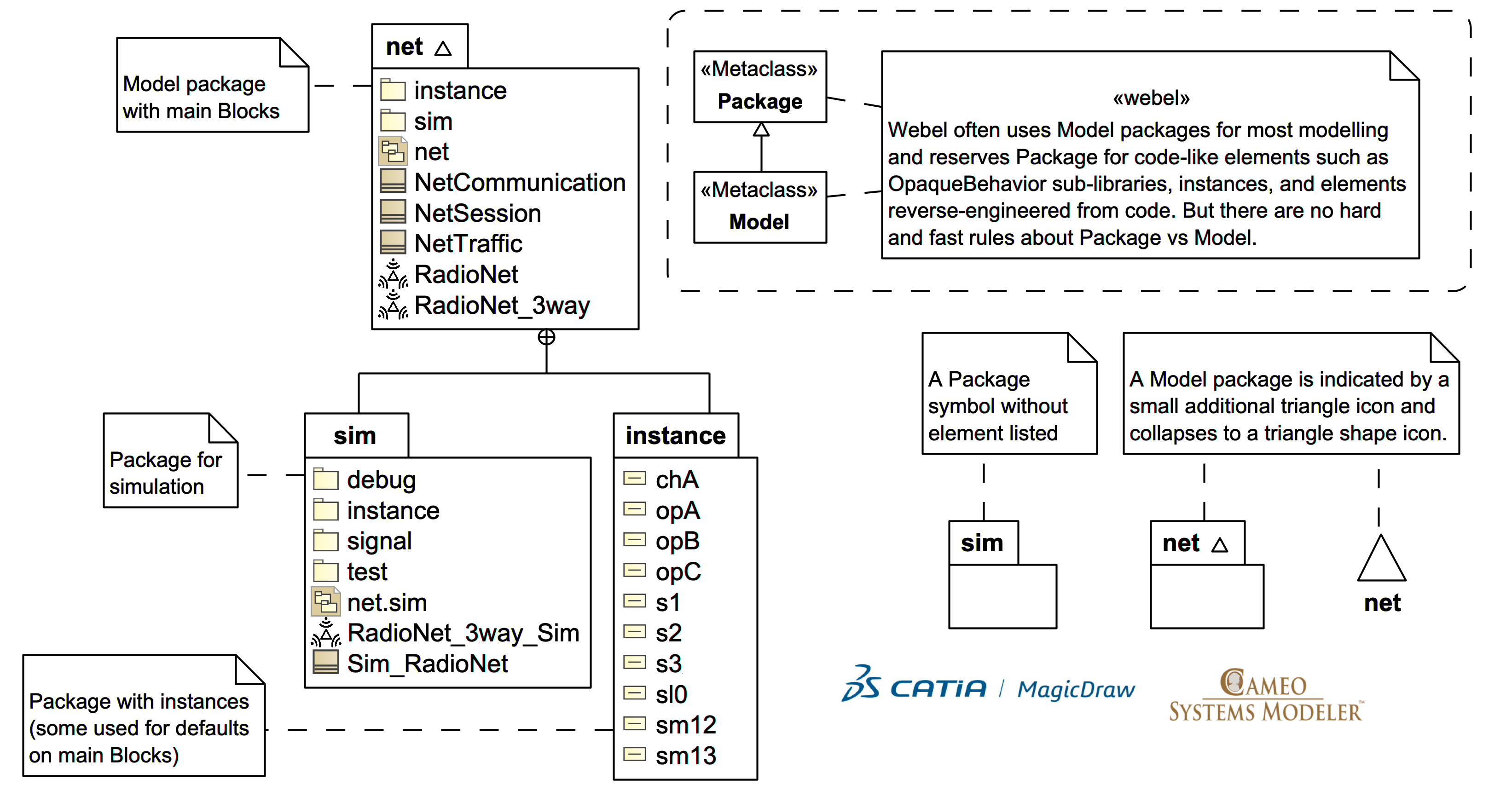 SysMLv1: Webel often uses Model packages for most modelling and reserves Package for code-like elements, OpaqueBehavior sub-libraries, instances, and elements reverse-engineered from code. But there are no hard and fast rules about Package vs Model.