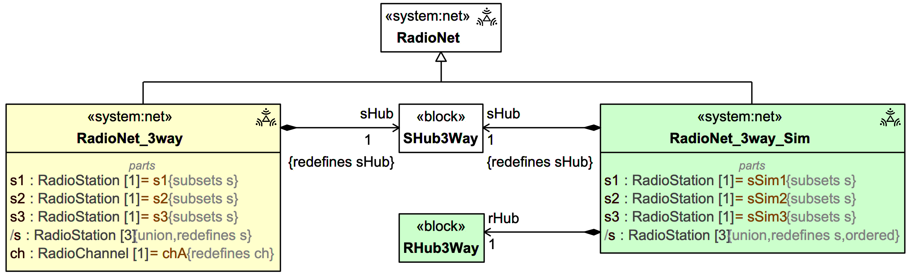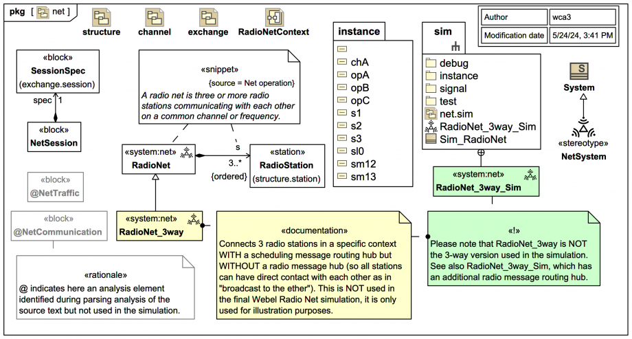 system and supporting elements, and two specialised 3-way radio net variants (one for Connector analysis, one for simulation). It includes a sub-package for instances (some of which are used as defaults in the simulation), and a 'sim' sub-package for performing the final Webel Radio Net simulation.Note that NetSystem
