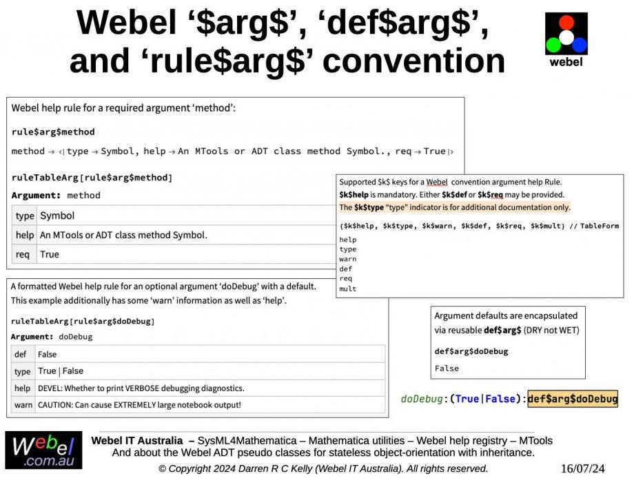 Please note that at this stage we are only examining use of the Webel '$arg$' help holders conventions in lower-level packages, which rely on "manual" naming conventions; in later slides we'll see how Webel extensions of MTools for OO such as the MArg class can be used to encapsulate the help holders for the Webel arguments convention.