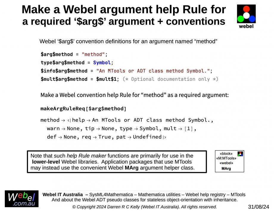 Please note that at this stage we are only examining use of the Webel '$arg$' help holders conventions in lower-level packages, which rely on "manual" naming conventions; in later slides we'll see how Webel extensions of MTools for OO such as the MArg class can be used to encapsulate the help holders for the Webel arguments convention.