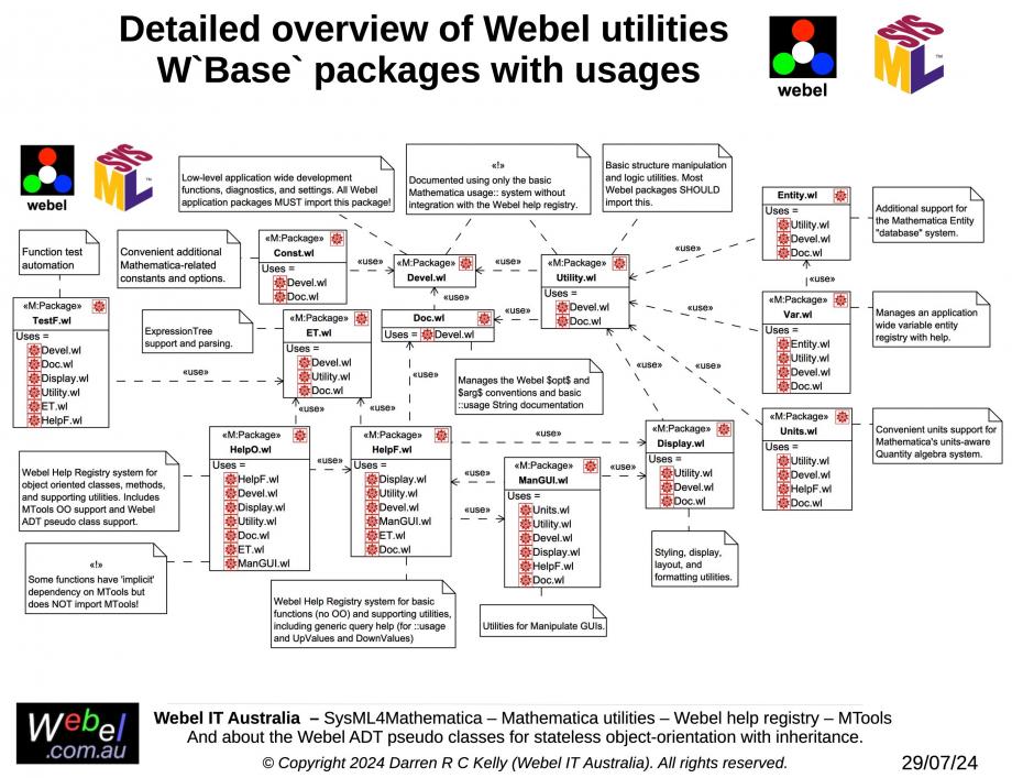 Gallery Tutorial [TECHNICAL SLIDE TRAIL] The Webel libraries for Wolfram Mathematica: With SysMLv1 models. Section SECTION: A brief look at the Webel W`Base` utilities for Mathematica Tags and keywords Topic level ESSENTIAL UML keywords Activity Usage SysML keywords Block Mathematica keywords package Needs Webel Mathematica keywords W` W`Base` Devel` Utility` Display` «M:Package» Const` ET` Var` HelpF` HelpO` ManGUI` TestF` Keywords Wolfram Wolfram Language Mathematica Webel::SysML4Mathematica Webel IT Australia Click on the image to view it full size For reference, an associated Policy Note (you don't need to visit this link yet): Webel: SysML4Mathematica: A SysML/UML Usage (keyword «uses») is used to indicate a Wolfram Package Needs import, where an «M:Package» is a specialisation of Block (not a SysML/UML Package) and denotes a Wolfram Language Package. Up next Webel W`Base` vs Git repository and Wolfram Player Pro encoded version Notes [CONVENTION, MODELLING, NAMING, POLICY]{SUBJECT-TO-CHANGE} Webel: SysML4Mathematica: A SysML/UML Usage (keyword «uses») is used to indicate a Wolfram Package Needs import, where an «M:Package» is a specialisation of Block (not a SysML/UML Package) and denotes a Wolfram Language Package. Snippets (quotes/extracts) Related slides (includes other tutorials) Related slides (backlinks, includes other tutorials) Visit also The Webel SysML4Mathematica recipe for modelling Wolfram Language code in Systems Modeling Language (SysML) for Model-Based Systems Engineering Visit also (backlinks) Flags Book traversal links for Detailed overview of Webel utilities W`Base` packages with usages Previous Up Next