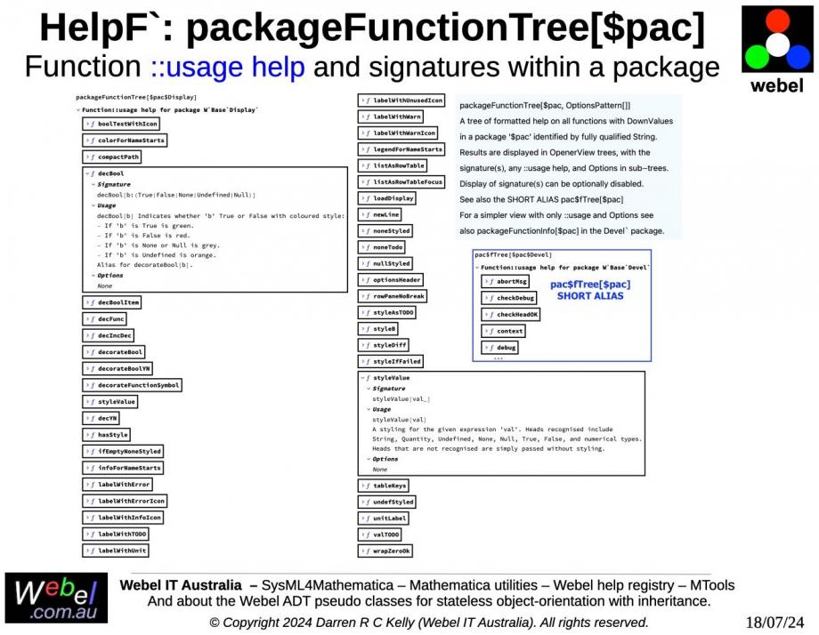 HelpF`: packageFunctionTree[$pac]: Function ::usage help and signatures within a package