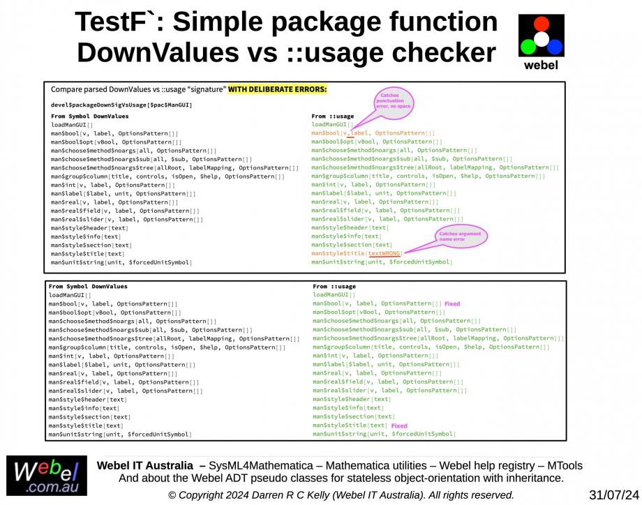 TestF`: Simple package function DownValues vs ::usage checker