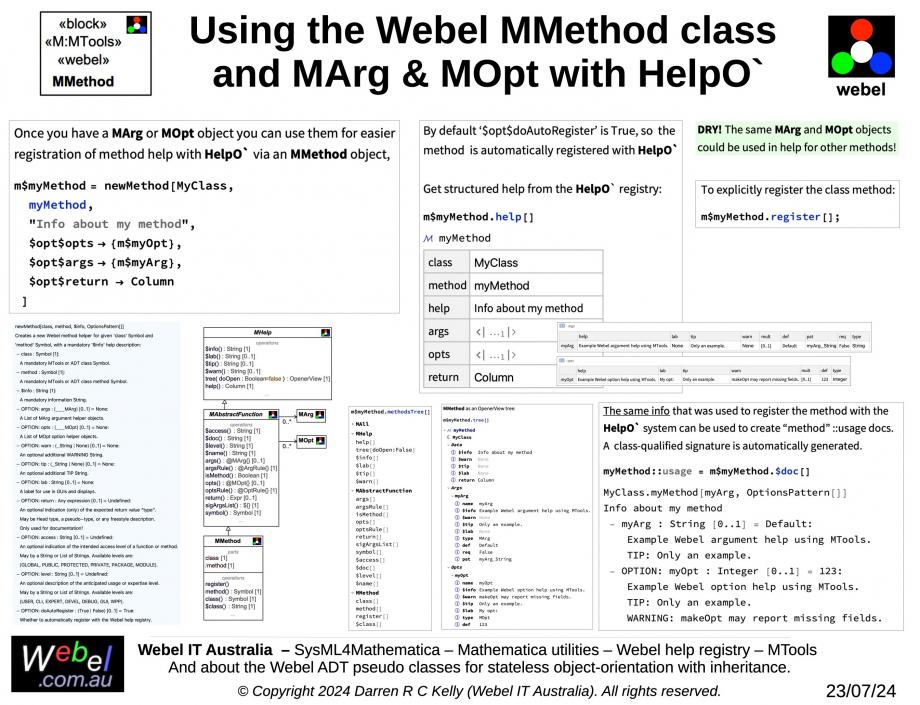 Gallery Tutorial [TECHNICAL SLIDE TRAIL] The Webel libraries for Wolfram Mathematica: With SysMLv1 models. Section SECTION: The Webel Doc` package and the HelpF, HelpO`& HelpM` help registry packages Tags and keywords Mathematica keywords MTools MTools::Class MTools::method Association Webel Mathematica keywords W`Base` HelpO` MMethod MOpt MArg newMethod Method.register helpMethod Keywords Wolfram Wolfram Language Mathematica Webel::SysML4Mathematica Webel IT Australia Abstract Data Types Webel:ADT Click on the image to view it full size Overview of the Webel HelpM` package with MTools-based help helper classes Up next HelpM`: Use MFunction and MMethod with MArg & MOpt for ::usage (and consistent with the HelpF` and HelpO` registries) Notes [TIP]{INFORMATIVE} Mathematica: TIPS for living with the user-contributed MTools for Object-Orientation (until a vendor-supported OO solution is eventually provided) [PATTERN, TIP, TOOL]{INFORMATIVE} Webel + Mathematica + MTools + SysML [POLICY]{SUBJECT-TO-CHANGE} Webel: Mathematica: The Method syntax for the user contributed MTools does not seem to support Method-specific ::usage. The Webel libraries offer method documentation support (including arguments and options) via the HelpO` class/method registry. Snippets (quotes/extracts) Related slides (includes other tutorials) Why the Webel HelpF` & HelpO` registries? The Webel HelpO`package class and method registry HelpO`: addClass: Register an MTools class by fully qualified package name HelpO`: addClass: Register an MTools class by fully qualified package name HelpO`: Part of the help registry for the Webel MAll universal MTools class and some methods HelpM`: Use Webel MOpt and MArg objects to create ‘$doc$’ Strings for ::usage help Webel ‘$arg$’ help is much easier with the MArg class using MTools! HelpM`: Use Webel MOpt and MArg objects to create ‘$doc$’ Strings for ::usage help Webel ‘$opt$’ help is much easier with the MOpt class using MTools! Webel ‘$opt$’ help even easier with makeOpt[$name] for MOpt! Related slides (backlinks, includes other tutorials) HelpM`: Use MFunction and MMethod with MArg & MOpt for ::usage (and consistent with the HelpF` and HelpO` registries) HelpM`: Using the Webel MClass helper with the MMethod helper and the HelpO` help registry Incremental benefit through Doc`, Var`, HelpF`, HelpO`, HelpM` HelpM`: Using the Webel MPackage helper with MFunction and MClass and the HelpF` and HelpO` help registries Basic SysMLv1 example: The HelpM` package MTools classes as Blocks About «pseudo» blocks (always prefixed with ‘@’) SysML: OptionsPattern[] “Generalizations” using Join:" Example: HelpM` helper classes new functions Convention-based MDemoConfig with fields for ‘$opt$’ options (works with any MTools class but prefer MOptsSet or MOpt) The Webel MAll universal class for MTools integrates with the HelpO` method registry HelpO`: Options management for MTools methods (lookup replaces OptionValue[]) Visit also Visit also (backlinks) Flags Book traversal links for HelpM`: Using the Webel MMethod class and MArg & MOpt with HelpO` Previous Up Next