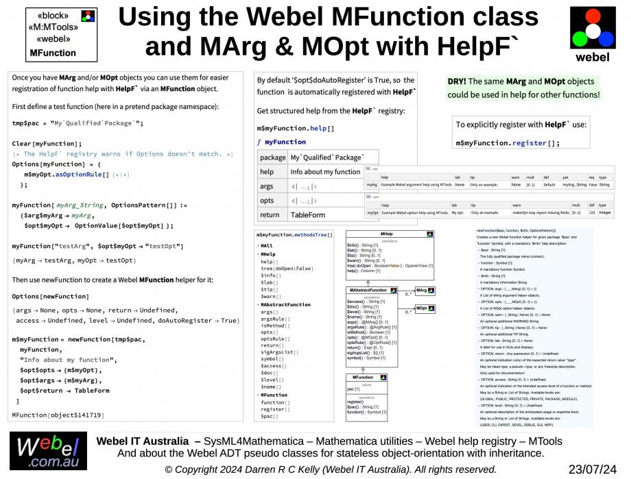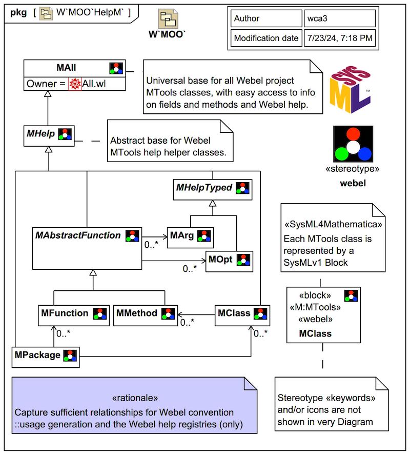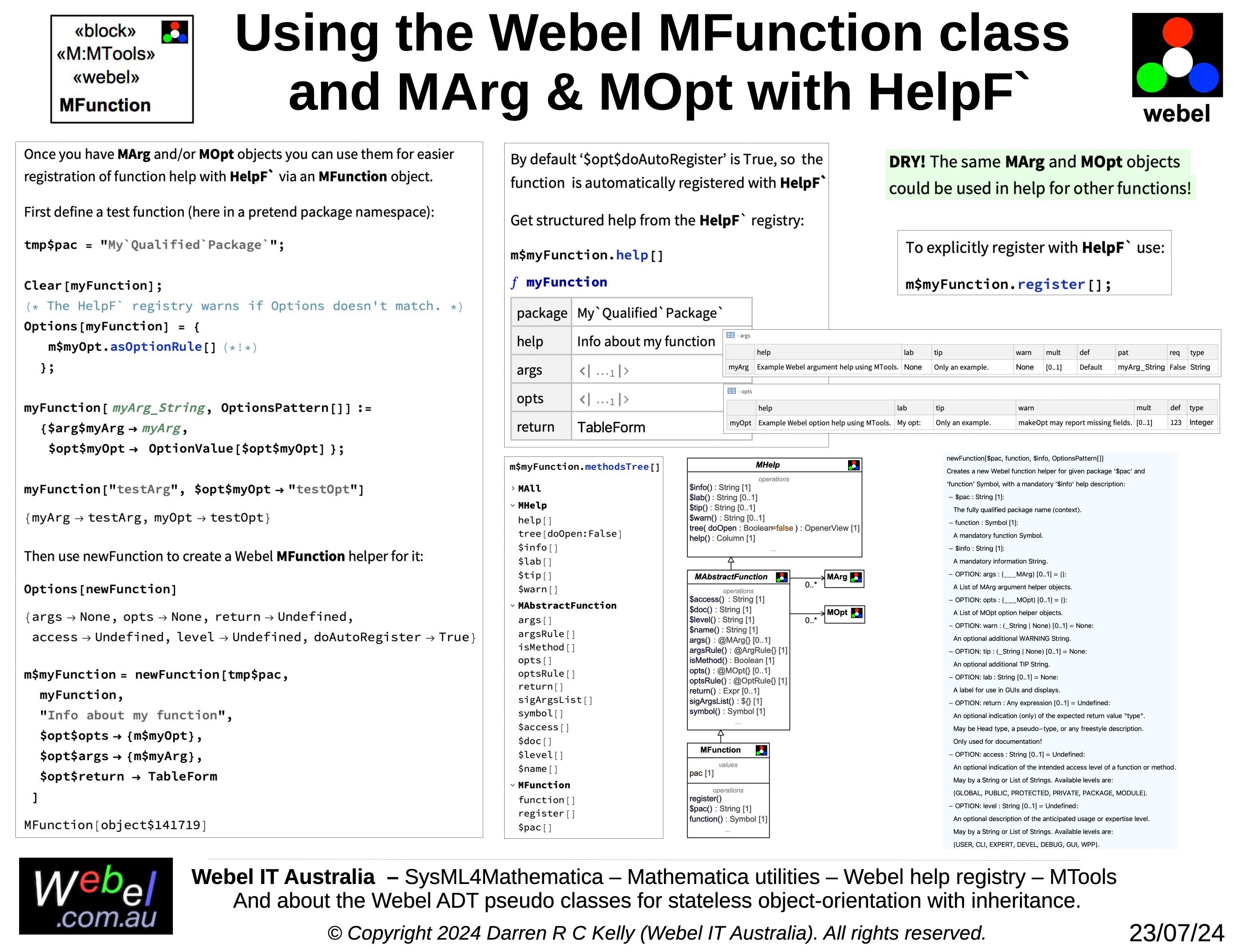 Gallery Tutorial [TECHNICAL SLIDE TRAIL] The Webel libraries for Wolfram Mathematica: With SysMLv1 models. Section SECTION: The Webel Doc` package and the HelpF, HelpO`& HelpM` help registry packages Tags and keywords Mathematica keywords MTools MTools::Class MTools::method Association Webel Mathematica keywords W`Base` HelpF` MOpt MArg MFunction newMethod helpFunction MFunction.register newFunction $opt$doAutoRegister Keywords Wolfram Wolfram Language Mathematica Webel::SysML4Mathematica Webel IT Australia Abstract Data Types Webel:ADT Click on the image to view it full size Overview of the Webel HelpM` package with MTools-based help helper classes Up next HelpM`: Using the Webel MMethod class and MArg & MOpt with HelpO` Notes [TIP]{INFORMATIVE} Mathematica: TIPS for living with the user-contributed MTools for Object-Orientation (until a vendor-supported OO solution is eventually provided) [PATTERN, TIP, TOOL]{INFORMATIVE} Webel + Mathematica + MTools + SysML Snippets (quotes/extracts) Related slides (includes other tutorials) HelpM`: Using the MFunction and MMethod helper classes with MArg & MOpt Why the Webel HelpF` & HelpO` registries? HelpF`example: helpFunction[$pac$HelpF, addFunction] HelpF`example: helpPackage[$pac$HelpF] HelpF`example: addFunction (1) HelpF`example: addFunction (2) HelpM`: Use Webel MOpt and MArg objects to create ‘$doc$’ Strings for ::usage help Webel ‘$arg$’ help is much easier with the MArg class using MTools! HelpM`: Use Webel MOpt and MArg objects to create ‘$doc$’ Strings for ::usage help Webel ‘$opt$’ help is much easier with the MOpt class using MTools! Webel ‘$opt$’ help even easier with makeOpt[$name] for MOpt! HelpF`: Pull Mathematica Options[] from a Webel HelpF` options superset HelpF`: Pull Mathematica Options[] for a function registered with addFunction The HelpF` & TestF` packages: General query based help HelpF`: packageFunctionTree[$pac]: Function ::usage help and signatures within a package TestF`: Function search by argument number/kind to aid testing automation (1) Related slides (backlinks, includes other tutorials) HelpM`: Use MFunction and MMethod with MArg & MOpt for ::usage (and consistent with the HelpF` and HelpO` registries) Basic SysMLv1 example: The HelpM` package MTools classes as Blocks About «pseudo» blocks (always prefixed with ‘@’) SysML: OptionsPattern[] “Generalizations” using Join:" Example: HelpM` helper classes new functions Visit also Visit also (backlinks) Flags Book traversal links for HelpM`: Using the Webel MFunction class and MArg & MOpt with HelpF` Previous Up Next