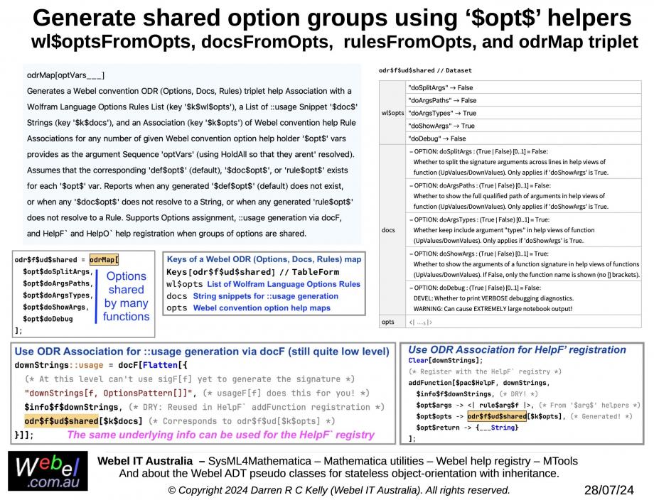 The Webel ODR Map (Options, Docs, Rules) Association "triplet" Association strategy provides for packages that import the Doc` package a higher level of Don't Repeat Yourself (DRY) reuse than available to just the Doc` package itself. Each triplet aspect can be used in many other ways and all generated from information in the same underlying '$opt$' help holders.
