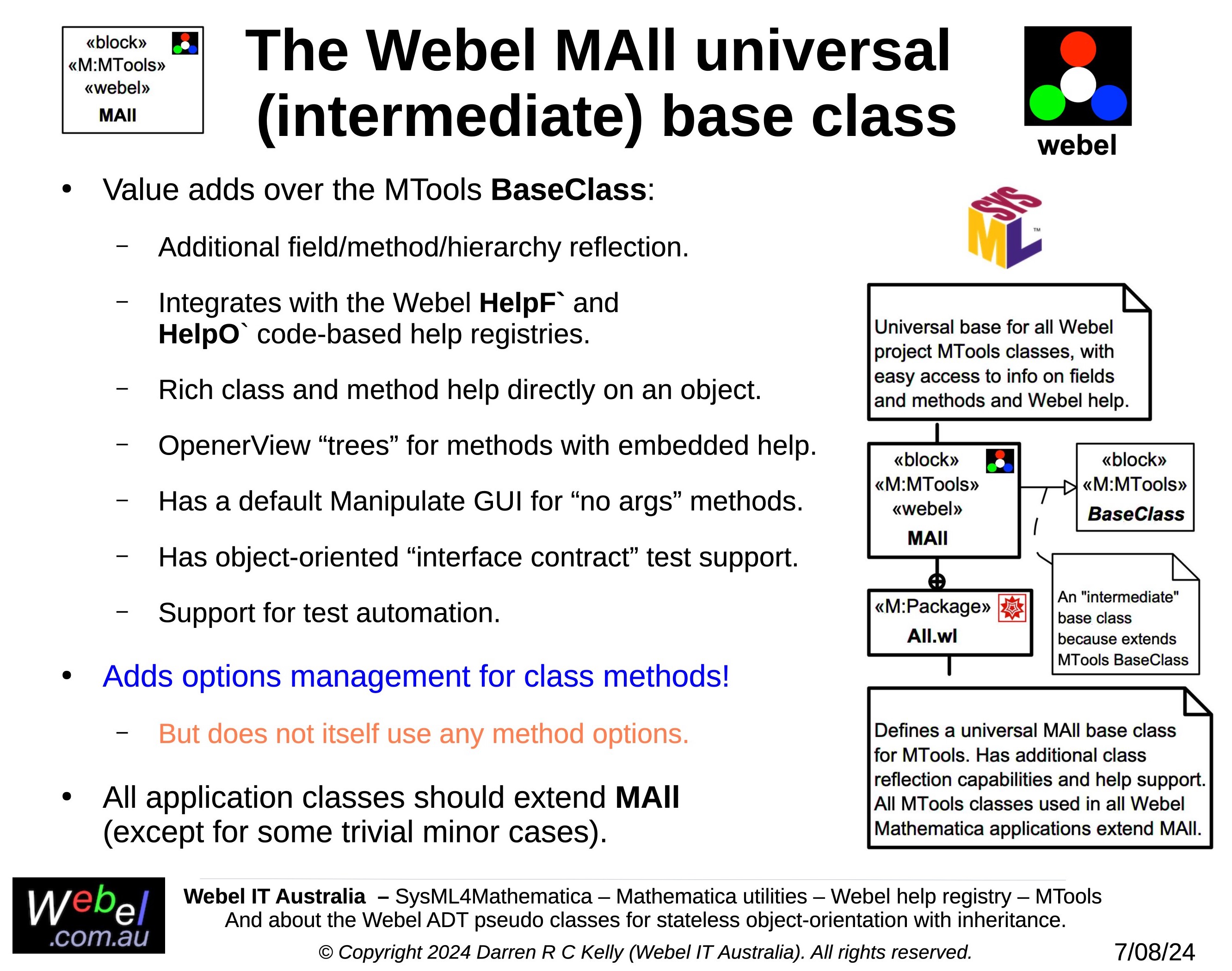 Gallery Tutorial [TECHNICAL SLIDE TRAIL] The Webel libraries for Wolfram Mathematica: With SysMLv1 models. Section SECTION: The Webel MAll & MOptsSet classes MTools extensions (with SysMLv1 models) Tags and keywords Mathematica keywords MTools MTools::Class MTools::method MTools::BaseClass Webel Mathematica keywords W`MOO` MAll All` Webel Options Keywords Wolfram Wolfram Language Mathematica Webel::SysML4Mathematica Webel IT Australia Systems Modeling Language SysMLv1 Slide kind SysML Block Definition Diagram (BDD) Click on the image to view it full size For reference, some associated Policy Notes (you don't need to visit these links yet): Webel: Mathematica: The Method syntax for the user contributed MTools does not seem to support Wolfram Language Options[]. The Webel MTools extensions offer options support via a Webel Options Association in combination with the HelpO` method registry. Webel: Mathematica: The Webel MAll universal base class does not itself use Webel method options (but does offer some support for method options for extending classes) Webel: Mathematica: The Method syntax for the user contributed MTools does not seem to support Method-specific ::usage. The Webel libraries offer method documentation support (including arguments and options) via the HelpO` class/method registry. Up next MDemo`: Overview of demo classes for MAll & MOptsSet Notes [POLICY]{STRICT} Webel: Mathematica: The Webel MAll universal base class does not itself use Webel method options (but does offer some support for method options for extending classes) [TIP]{INFORMATIVE} Mathematica: TIPS for living with the user-contributed MTools for Object-Orientation (until a vendor-supported OO solution is eventually provided) [PATTERN, TIP, TOOL]{INFORMATIVE} Webel + Mathematica + MTools + SysML [POLICY]{SUBJECT-TO-CHANGE} Webel: Mathematica: The Method syntax for the user contributed MTools does not seem to support Wolfram Language Options[]. The Webel MTools extensions offer options support via a Webel Options Association in combination with the HelpO` method registry. [POLICY]{SUBJECT-TO-CHANGE} Webel: Mathematica: The Method syntax for the user contributed MTools does not seem to support Method-specific ::usage. The Webel libraries offer method documentation support (including arguments and options) via the HelpO` class/method registry. Snippets (quotes/extracts) Related slides (includes other tutorials) Introduction to the Webel All` package and the MAll universal class extending MTools Example: Representation of a Webel MAll class MTools method as a SysML Activity Diagram MDemo`: Overview of demo classes for MAll & MOptsSet The MAllDemo class with MOptsSetDemo Related slides (backlinks, includes other tutorials) MAll: Methods related to classes and contracts: Example: MDemoAll: From the MAll self-test GUI MAll: All public Methods with signatures MAll: methodHelp and methodFind: Short aliases mH and mF MAll: isContractOf for PatternTest (easier contract checks for MTools) The Webel MAll universal class for MTools integrates with the HelpO` method registry HelpO`: Options management for MTools methods (lookup replaces OptionValue[]) Visit also Visit also (backlinks) Flags Book traversal links for The Webel MAll universal (intermediate) base class Previous Up Next