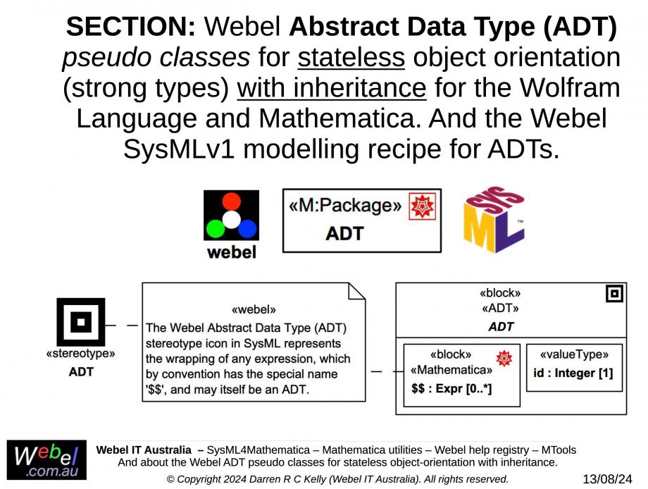 Gallery Tutorial [TECHNICAL SLIDE TRAIL] The Webel libraries for Wolfram Mathematica: With SysMLv1 models. Section SECTION: The Webel Abstract Data Type (ADT) stateless pseudo-classes with inheritance (with SysMLv1 models) Tags and keywords UML keywords Stereotype Stereotype:icon SysML keywords Block Mathematica keywords expression Webel Mathematica keywords ADT` Webel ADT Keywords Wolfram Wolfram Language Mathematica Webel::SysML4Mathematica Webel IT Australia Abstract Data Types Webel:ADT Click on the image to view it full size For reference, some associated Policy Notes (you don't need to visit these links yet): Mathematica: Webel ADT pseudo classes: POLICY: The expression '$$' is reserved as the primary named parameter for the defining pattern of all ADT classes that extend the universal base 'ADT' class. Mathematica: Webel ADT pseudo classes: A tricky POLICY & CONVENTION: Client packages MUST access the special "wrapped" primary '$$' via $ContextAliases! The recommended alias is "A`" (which stands of course for ADT). Up next Webel Abstract Data Types (ADTs) vs the user-contributed MTools for OO Notes [POLICY]{STRICT} Mathematica: Webel ADT pseudo classes: POLICY: The expression '$$' is reserved as the primary named parameter for the defining pattern of all ADT classes that extend the universal base 'ADT' class. [CONVENTION, POLICY, TIP]{STRICT} Mathematica: Webel ADT pseudo classes: A tricky POLICY & CONVENTION: Client packages MUST access the special "wrapped" primary '$$' via $ContextAliases! The recommended alias is "A`" (which stands of course for ADT). Snippets (quotes/extracts) Related slides (includes other tutorials) Related slides (backlinks, includes other tutorials) Webel Abstract Data Types (ADTs) vs the user-contributed MTools for OO Webel ADTs include inheritance (and aren’t actually formal ADTs) Webel ADT hierarchy views as tree, graph, and SysML Webel ADT`package: Some ADT pseudo class utility functions in a ::usage help viewer. Diagnostic, help, and development functions. Mini SysMLv1 BDD view of the Webel ADT Block SysMLv1 Internal Block Diagram (IBD) of the Webel ADT base class Simple Webel ADT in the development view dV[adt] and class/methods help hC[adt] Classes in the ADT` package: Extendable ADT pseudo classes have corresponding "definer functions" Extending ADT sub-classes represented as SysML Blocks with redefined wrapped ‘$$’ Creating new ADTs that extend other classes using a definer function (and adt$addSuper) Webel «adt:pseudo» elements in the SysMLv1 ADT model (1) Webel «adt:pseudo» elements in the SysMLv1 ADT model (2) Chained wrapped ADT pseudo Lists: Example: EX` package structured data ADTs Chained wrapped ADT pseudos as a SysMLv1 Internal Block Diagram (IBD) Clients of List ADTs don’t usually directly access the wrapped Lists (but can for testing with ADT⊙get which BREAKS ENCAPSULATION) Webel ADT SysMLv1 Stereotypes adt$graphHierarchy example: The EX` package for structured data ADT finder functions and “methods” adt$findUp, adt$findUpArg, ADT⊙fM ADT help functions and methods: adt$treeHierarchy (adt$tH), adt$hC, ADT⊙hC: Example: XL$Cell ADT`: helpADT[class]: help on methods registered with HelpO`: Example: XL$Cell adt$store, adt$fetch, and «adt:ref»: Example: Reference XL$ResourcesMap by ID in US$ResourcesHolder. Visit also Mathematica: POLICY NOTES for the Webel Abstract Data Type (ADT) pseudo classes with inheritance for the Wolfram Language Dr Darren of Webel IT Australia makes the case for better object-orientation for Mathematica using pseudo class ADTs without losing the super-functional power of the Wolfram Language Visit also (backlinks) Flags Book traversal links for Introduction to Webel Abstract Data Types (ADTs) with SysMLv1 models Previous Up Next