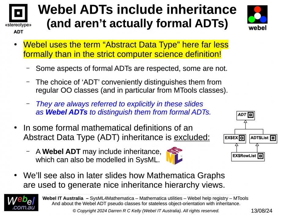 In any case, where it appears here prefixed as Webel ADT it does not mean a formal Abstract Data Type (ADT), it just means a stateless pseudo class or strong type implemented using TagSetDelayed in the Wolfram Language.