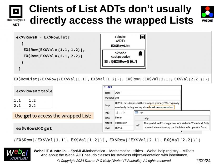 Gallery Tutorial [TECHNICAL SLIDE TRAIL] The Webel libraries for Wolfram Mathematica: With SysMLv1 models. Section SECTION: The Webel Abstract Data Type (ADT) stateless pseudo-classes with inheritance (with SysMLv1 models) Tags and keywords UML keywords Generalization Property::redefinedProperty Mathematica keywords XMLElement Webel Mathematica keywords ADT` Webel ADT «adt:pseudo» @EX$Row{} EX$RowList EX$Row @EX$Val{} EX$Val @EX$Val ADT$List {} $$ ADT⊙get Keywords Wolfram Wolfram Language Mathematica Webel::SysML4Mathematica Webel IT Australia Abstract Data Types Webel:ADT Systems Modeling Language SysMLv1 Click on the image to view it full size For reference, some associated Policy Notes (you don't need to visit these links yet): Mathematica: Webel ADT pseudo classes: CONVENTION: PROVISIONAL: The infix operator for calling ADT-Methods on ADT "objects" is the CircleDot (⊙ in Notebooks). ISSUE: \[CircleDot] is NOT GOOD FOR USE IN IDEs! Mathematica: Webel ADT pseudo classes: The ADT⊙get method may be used to access the '$$' wrapped primary. This is intended for development and testing purposes only (not for regular use by clients) since it BREAKS ENCAPSULATION! Up next Webel ADT SysMLv1 Stereotypes Notes [CONVENTION, NAMING, POLICY]{PROPOSED} Mathematica: Webel ADT pseudo classes: CONVENTION: PROVISIONAL: The infix operator for calling ADT-Methods on ADT "objects" is the CircleDot (⊙ in Notebooks). ISSUE: \[CircleDot] is NOT GOOD FOR USE IN IDEs! [POLICY]{STRICT} Mathematica: Webel ADT pseudo classes: The ADT⊙get method may be used to access the '$$' wrapped primary. This is intended for development and testing purposes only (not for regular use by clients) since it BREAKS ENCAPSULATION! Snippets (quotes/extracts) Related slides (includes other tutorials) Introduction to Webel Abstract Data Types (ADTs) with SysMLv1 models Webel Abstract Data Types (ADTs) vs the user-contributed MTools for OO Webel ADTs include inheritance (and aren’t actually formal ADTs) Webel ADT hierarchy views as tree, graph, and SysML Webel ADT`package: Some ADT pseudo class utility functions in a ::usage help viewer. Diagnostic, help, and development functions. Classes in the ADT` package: Extendable ADT pseudo classes have corresponding "definer functions" Simple Webel ADT in the development view dV[adt] and class/methods help hC[adt] Creating new ADTs that extend other classes using a definer function (and adt$addSuper) Webel «adt:pseudo» elements in the SysMLv1 ADT model (1) Chained wrapped ADT pseudos as a SysMLv1 Internal Block Diagram (IBD) Related slides (backlinks, includes other tutorials) Webel ADT SysMLv1 Stereotypes adt$graphHierarchy example: The EX` package for structured data ADT finder functions and “methods” adt$findUp, adt$findUpArg, ADT⊙fM ADT help functions and methods: adt$treeHierarchy (adt$tH), adt$hC, ADT⊙hC: Example: XL$Cell ADT`: helpADT[class]: help on methods registered with HelpO`: Example: XL$Cell Visit also Mathematica: POLICY NOTES for the Webel Abstract Data Type (ADT) pseudo classes with inheritance for the Wolfram Language Dr Darren of Webel IT Australia makes the case for better object-orientation for Mathematica using pseudo class ADTs without losing the super-functional power of the Wolfram Language Visit also (backlinks) Flags Book traversal links for Clients of List ADTs don’t usually directly access the wrapped Lists (but can for testing with ADT⊙get which BREAKS ENCAPSULATION) Previous Up Next
