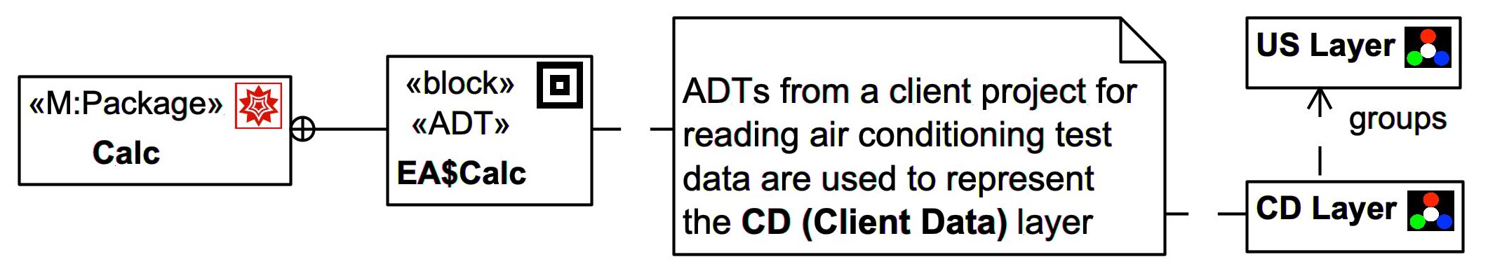 Note that 'CD' here is not the name of an actual package, it is a placeholder for a specific client's domain packages; in the examples shown here packages from an actual client project are used (but with obfuscated data) with ADTs prefixed by 'EA' representing the Client Data layer.