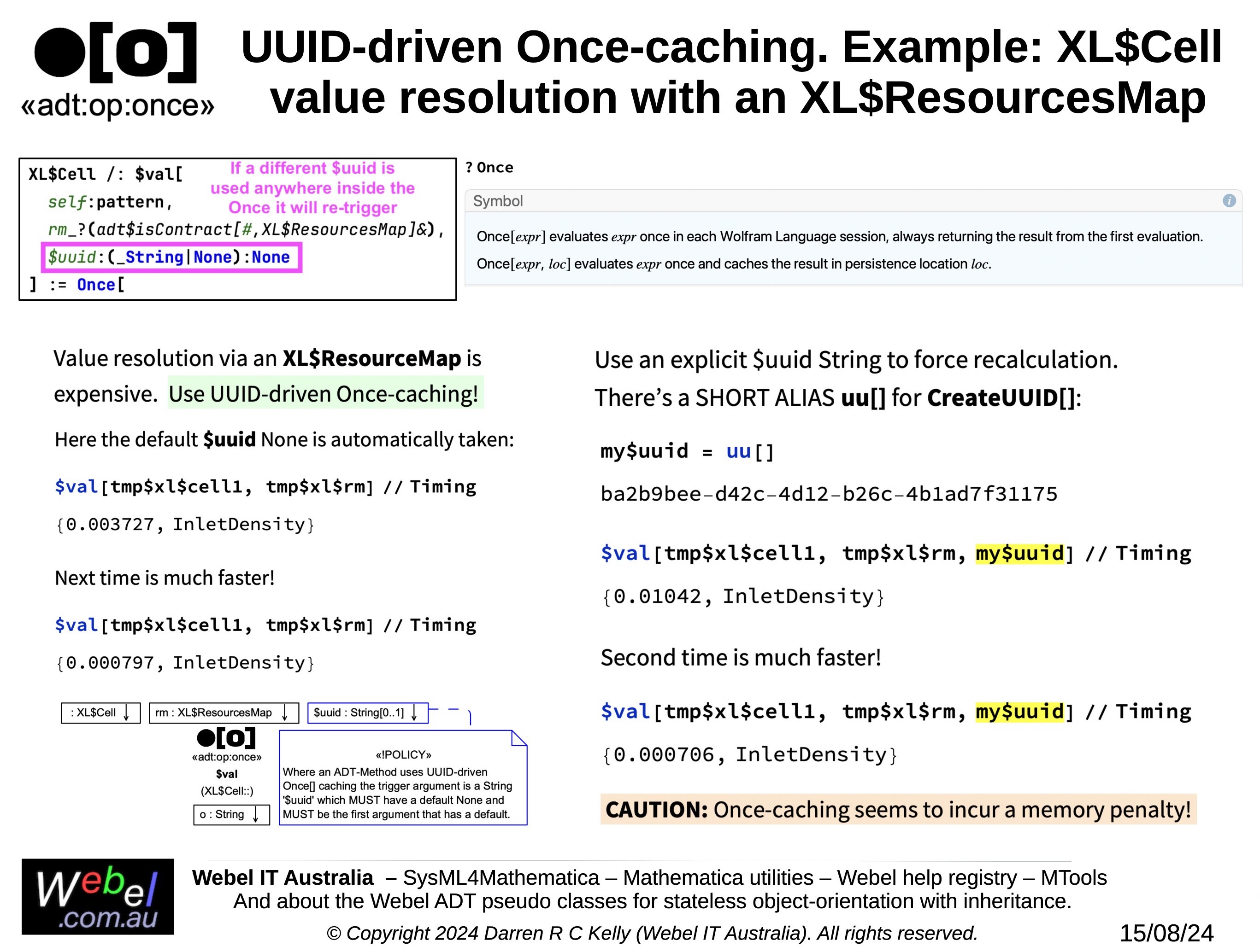 Gallery Tutorial [TECHNICAL SLIDE TRAIL] The Webel libraries for Wolfram Mathematica: With SysMLv1 models. Section SECTION: Webel ADT case study: Extracting structured data from unstructured Open XML spreadsheet data Tags and keywords Mathematica keywords XMLElement Webel Mathematica keywords ADT` Webel ADT XL layer XL` OpenXML XL$Cell XL$Cell⊙$val XL$ResourcesMap Keywords Wolfram Wolfram Language Mathematica Webel::SysML4Mathematica Webel IT Australia Abstract Data Types Webel:ADT Systems Modeling Language SysMLv1 Click on the image to view it full size For reference, an associated Policy Note (you don't need to visit this link yet): Mathematica: Webel ADT pseudo classes: POLICY: Where an ADT-Method uses UUID-driven Once[] caching the trigger argument is a String '$uuid' which MUST have a default None and MUST be the first argument that has a default. Up next XL$Cell with a VBA formula and XL$F Notes [EXPLANATION, TIP]{RECOMMENDED} Mathematica: SUPER TIP: Use CreateUUID[] to trigger recalculation against Once[] to create a flexible optionally caching function! (May incur a memory penalty, consider also using a 'loc' persistence location.) [CONVENTION, POLICY]{STRICT} Mathematica: Webel ADT pseudo classes: POLICY: The Abstract Data Types (ADTs) are stateless functional (although inheritance and overrides are supported), with no caching by default (although there is nice optional caching using CreateUUID[] and Once[]). [CONVENTION, POLICY]{STRICT} Mathematica: Webel ADT pseudo classes: POLICY: Where an ADT-Method uses UUID-driven Once[] caching the trigger argument is a String '$uuid' which MUST have a default None and MUST be the first argument that has a default. Snippets (quotes/extracts) Related slides (includes other tutorials) XL$Cell value resolution for “text” requires an XL$ResourcesMap (Real, Integer, and Boolean value resolution does not) Webel ADT hierarchy views as tree, graph, and SysML ADT hierarchy for the XL` package for reading unstructured data from OpenXML XLSM bundles Overview of the Webel OpenXML libraries ADT Case Study Typical unstructured spreadsheet data imported into the XL layer XL$Row and XL$Cell under the hood Related slides (backlinks, includes other tutorials) ADT`: helpADT[class]: help on methods registered with HelpO`: Example: XL$Cell XL$Cell with a VBA formula and XL$F Spreadsheet “units indicator” HACKS do NOT use a units-aware Quantity algebra! Units and Quantity extraction with US$Row XL$RowList vs XL$Row vs XL$Cell adt$store, adt$fetch, and «adt:ref»: Example: Reference XL$ResourcesMap by ID in US$ResourcesHolder. US$RowList spanned rows filling US$RowList sub-list extraction US$RowList & EX$RowMap column extraction and custom styled tables US$RowList “section” extraction UD` demo package for US$Section UD` demo: Basic US$ValuesSection US$ValuesSection to EX$RowMap US$SectionMap auto-detection Specific Component-aware sub-ADTs Demo Component values extraction (but not yet as EX Component ADTs) The demo UD$EX$Component for extracted structured EX Layer data The US$SheetManager as a bridge between the US Layer and EX Layer Extracted demo UD$EX$Component:Demo UD$EX$Components: Creative views in the UD$SheetManager Demo UD$EX$Components analyser UD$EX$Components as (quick) XML UD$EX$Component “database” demo (using a Wolfram Language EntityStore) Visit also Mathematica: POLICY NOTES for the Webel Abstract Data Type (ADT) pseudo classes with inheritance for the Wolfram Language Visit also (backlinks) Flags Book traversal links for UUID-driven Once-caching. Example: XL$Cell value resolution with an XL$ResourcesMap Previous Up Next