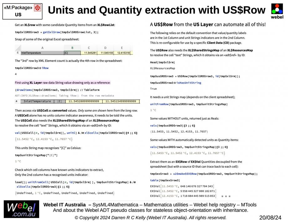 Gallery Tutorial [TECHNICAL SLIDE TRAIL] The Webel libraries for Wolfram Mathematica: With SysMLv1 models. Section SECTION: Webel ADT case study: Extracting structured data from unstructured Open XML spreadsheet data Tags and keywords Mathematica keywords Quantity Webel Mathematica keywords ADT` Webel ADT XL layer US layer US$Row US$Cell EX$Val EX$Row «adt:ref» XL$ResourcesMap XL$SharedStringsMap Keywords Wolfram Wolfram Language Mathematica Webel::SysML4Mathematica Webel IT Australia Abstract Data Types Webel:ADT Systems Modeling Language SysMLv1 Click on the image to view it full size For reference, an associated Policy Note (you don't need to visit this link yet): Mathematica: The Webel Units` package has Quantity variables for frequently used units using a naming convention 'unit$[Symbol]' or 'unit[DescriptiveName]' or unit[Acronym], each with a corresponding '$unit...' for the units identifier String(s). To learn how ID-based lookup of large ADTs like XL$ResourcesMap is handled visit this earlier slide: adt$store, adt$fetch, and «adt:ref»: Example: Reference XL$ResourcesMap by ID in US$ResourcesHolder. Up next US$RowList spanned rows filling Notes [CONVENTION, POLICY]{INFORMATIVE} Mathematica: Webel ADT pseudo classes: «adt:ref» applied to a property indicates that it is resolved by ID through the ADT store using adt$fetch[id]. Use adt$store[adt] for very large ADTs and for cleaner ADT views and easier Notebook development. Snippets (quotes/extracts) Related slides (includes other tutorials) adt$store, adt$fetch, and «adt:ref»: Example: Reference XL$ResourcesMap by ID in US$ResourcesHolder. XL$Cell value resolution for “text” requires an XL$ResourcesMap (Real, Integer, and Boolean value resolution does not) UUID-driven Once-caching. Example: XL$Cell value resolution with an XL$ResourcesMap Webel ADT hierarchy views as tree, graph, and SysML ADT hierarchy for the XL` package for reading unstructured data from OpenXML XLSM bundles Overview of the Webel OpenXML libraries ADT Case Study Typical unstructured spreadsheet data imported into the XL layer XL$Row and XL$Cell under the hood XL$Cell with a VBA formula and XL$F Spreadsheet “units indicator” HACKS do NOT use a units-aware Quantity algebra! Related slides (backlinks, includes other tutorials) US$RowList spanned rows filling US$RowList sub-list extraction US$RowList & EX$RowMap column extraction and custom styled tables US$RowList “section” extraction UD` demo package for US$Section UD` demo: Basic US$ValuesSection US$ValuesSection to EX$RowMap US$SectionMap auto-detection Specific Component-aware sub-ADTs Demo Component values extraction (but not yet as EX Component ADTs) The demo UD$EX$Component for extracted structured EX Layer data The US$SheetManager as a bridge between the US Layer and EX Layer Extracted demo UD$EX$Component:Demo UD$EX$Components: Creative views in the UD$SheetManager Demo UD$EX$Components analyser UD$EX$Components as (quick) XML UD$EX$Component “database” demo (using a Wolfram Language EntityStore) Visit also Mathematica: POLICY NOTES for the Webel Abstract Data Type (ADT) pseudo classes with inheritance for the Wolfram Language Visit also (backlinks) Flags Book traversal links for Units and Quantity extraction with US$Row Previous Up Next