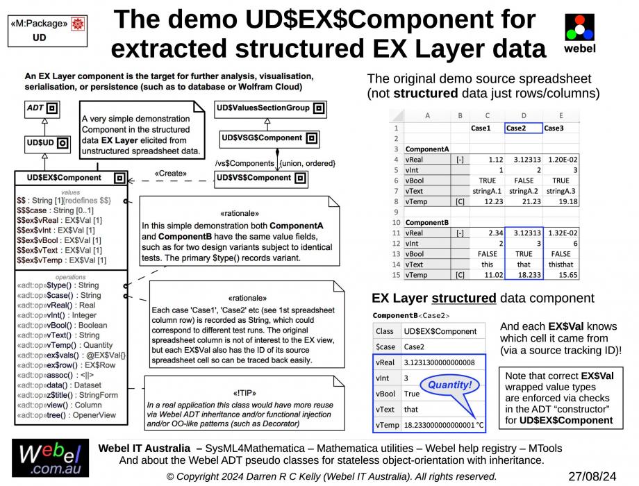 Gallery Tutorial [TECHNICAL SLIDE TRAIL] The Webel libraries for Wolfram Mathematica: With SysMLv1 models. Section SECTION: Webel ADT case study: Extracting structured data from unstructured Open XML spreadsheet data Tags and keywords Webel Mathematica keywords ADT` Webel ADT UD$EX$Component UD$ValuesSectionGroup UD$VSG$Component UD$VS$Component UD$ValuesSection US$ValuesSection US$ValuesSectionGroup @EX$Val @EX$Val{} Keywords Wolfram Wolfram Language Mathematica Webel::SysML4Mathematica Webel IT Australia Abstract Data Types Webel:ADT Systems Modeling Language SysMLv1 Click on the image to view it full size For reference, some associated Policy Notes (you don't need to visit these links yet): Mathematica: Webel ADT pseudo classes: The validity of the type of a wrapped '$$' value of an EX$Val may be checked in ADT "constructors" which have type checking utility support. This strategy has been chosen over sub-types of EX$Val. Mathematica: Webel ADT pseudo classes: An EX$Val has concise methods for testing the type of its wrapped '$$' value: isR, isI, isB, isQ, isS. These may be used in ADT "constructor" type tests. Up next The US$SheetManager as a bridge between the US Layer and EX Layer Notes [CAPABILITY]{SUBJECT-TO-CHANGE} Mathematica: Webel ADT pseudo classes: The validity of the type of a wrapped '$$' value of an EX$Val may be checked in ADT "constructors" which have type checking utility support. This strategy has been chosen over sub-types of EX$Val. [CAPABILITY]{SUBJECT-TO-CHANGE} Mathematica: Webel ADT pseudo classes: An EX$Val has concise methods for testing the type of its wrapped '$$' value: isR, isI, isB, isQ, isS. These may be used in ADT "constructor" type tests. [CAPABILITY]{SUBJECT-TO-CHANGE} Mathematica: Webel ADT pseudo classes: 'Q: Do I have to use these EX$Val scalar "atom" thingies and the EX$Row, EX$RowList, and EX$RowMap? Can't I just use Wolfram Language Lists and Associations?' A: Of course you can also use the basic Wolfram Language! Snippets (quotes/extracts) Related slides (includes other tutorials) adt$store, adt$fetch, and «adt:ref»: Example: Reference XL$ResourcesMap by ID in US$ResourcesHolder. XL$Cell value resolution for “text” requires an XL$ResourcesMap (Real, Integer, and Boolean value resolution does not) UUID-driven Once-caching. Example: XL$Cell value resolution with an XL$ResourcesMap Webel ADT hierarchy views as tree, graph, and SysML ADT hierarchy for the XL` package for reading unstructured data from OpenXML XLSM bundles Overview of the Webel OpenXML libraries ADT Case Study Typical unstructured spreadsheet data imported into the XL layer XL$Row and XL$Cell under the hood XL$Cell with a VBA formula and XL$F Spreadsheet “units indicator” HACKS do NOT use a units-aware Quantity algebra! Units and Quantity extraction with US$Row US$RowList spanned rows filling US$RowList sub-list extraction US$RowList & EX$RowMap column extraction and custom styled tables US$RowList “section” extraction UD` demo package for US$Section UD` demo: Basic US$ValuesSection US$ValuesSection to EX$RowMap US$SectionMap auto-detection Specific Component-aware sub-ADTs Demo Component values extraction (but not yet as EX Component ADTs) Related slides (backlinks, includes other tutorials) The US$SheetManager as a bridge between the US Layer and EX Layer Extracted demo UD$EX$Component:Demo UD$EX$Components: Creative views in the UD$SheetManager Demo UD$EX$Components analyser UD$EX$Components as (quick) XML UD$EX$Component “database” demo (using a Wolfram Language EntityStore) Visit also Mathematica: POLICY NOTES for the Webel Abstract Data Type (ADT) pseudo classes with inheritance for the Wolfram Language Visit also (backlinks) Flags Book traversal links for The demo UD$EX$Component for extracted structured EX Layer data Previous Up Next