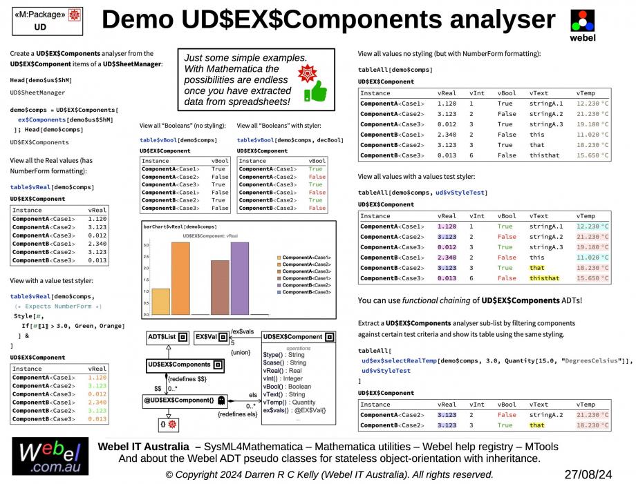 Gallery Tutorial [TECHNICAL SLIDE TRAIL] The Webel libraries for Wolfram Mathematica: With SysMLv1 models. Section SECTION: Webel ADT case study: Extracting structured data from unstructured Open XML spreadsheet data Tags and keywords Webel Mathematica keywords ADT` Webel ADT UD$EX$Component UD$EX$Components UD$EX$Components⊙ud$ex$selectRealTemp UD$EX$Components⊙tableAll UD$EX$Components⊙table$vReal UD$EX$Components⊙table$vBool Keywords Wolfram Wolfram Language Mathematica Webel::SysML4Mathematica Webel IT Australia Abstract Data Types Webel:ADT Systems Modeling Language SysMLv1 Slide kind SysML Block Definition Diagram (BDD) Click on the image to view it full size For reference, an associated Policy Note (you don't need to visit this link yet): Mathematica: Webel ADT pseudo classes: 'Q: Do I have to use these EX$Val scalar "atom" thingies and the EX$Row, EX$RowList, and EX$RowMap? Can't I just use Wolfram Language Lists and Associations?' A: Of course you can also use the basic Wolfram Language! Up next UD$EX$Components as (quick) XML Notes [CAPABILITY]{SUBJECT-TO-CHANGE} Mathematica: Webel ADT pseudo classes: 'Q: Do I have to use these EX$Val scalar "atom" thingies and the EX$Row, EX$RowList, and EX$RowMap? Can't I just use Wolfram Language Lists and Associations?' A: Of course you can also use the basic Wolfram Language! Snippets (quotes/extracts) Related slides (includes other tutorials) adt$store, adt$fetch, and «adt:ref»: Example: Reference XL$ResourcesMap by ID in US$ResourcesHolder. XL$Cell value resolution for “text” requires an XL$ResourcesMap (Real, Integer, and Boolean value resolution does not) UUID-driven Once-caching. Example: XL$Cell value resolution with an XL$ResourcesMap Webel ADT hierarchy views as tree, graph, and SysML ADT hierarchy for the XL` package for reading unstructured data from OpenXML XLSM bundles Overview of the Webel OpenXML libraries ADT Case Study Typical unstructured spreadsheet data imported into the XL layer XL$Row and XL$Cell under the hood XL$Cell with a VBA formula and XL$F Spreadsheet “units indicator” HACKS do NOT use a units-aware Quantity algebra! Units and Quantity extraction with US$Row US$RowList spanned rows filling US$RowList sub-list extraction US$RowList & EX$RowMap column extraction and custom styled tables US$RowList “section” extraction UD` demo package for US$Section UD` demo: Basic US$ValuesSection US$ValuesSection to EX$RowMap US$SectionMap auto-detection Specific Component-aware sub-ADTs Demo Component values extraction (but not yet as EX Component ADTs) The demo UD$EX$Component for extracted structured EX Layer data Extracted demo UD$EX$Component:Demo UD$EX$Components: Creative views in the UD$SheetManager Related slides (backlinks, includes other tutorials) UD$EX$Components as (quick) XML UD$EX$Component “database” demo (using a Wolfram Language EntityStore) Visit also Mathematica: POLICY NOTES for the Webel Abstract Data Type (ADT) pseudo classes with inheritance for the Wolfram Language Visit also (backlinks) Flags Book traversal links for Demo UD$EX$Components analyser Previous Up Next