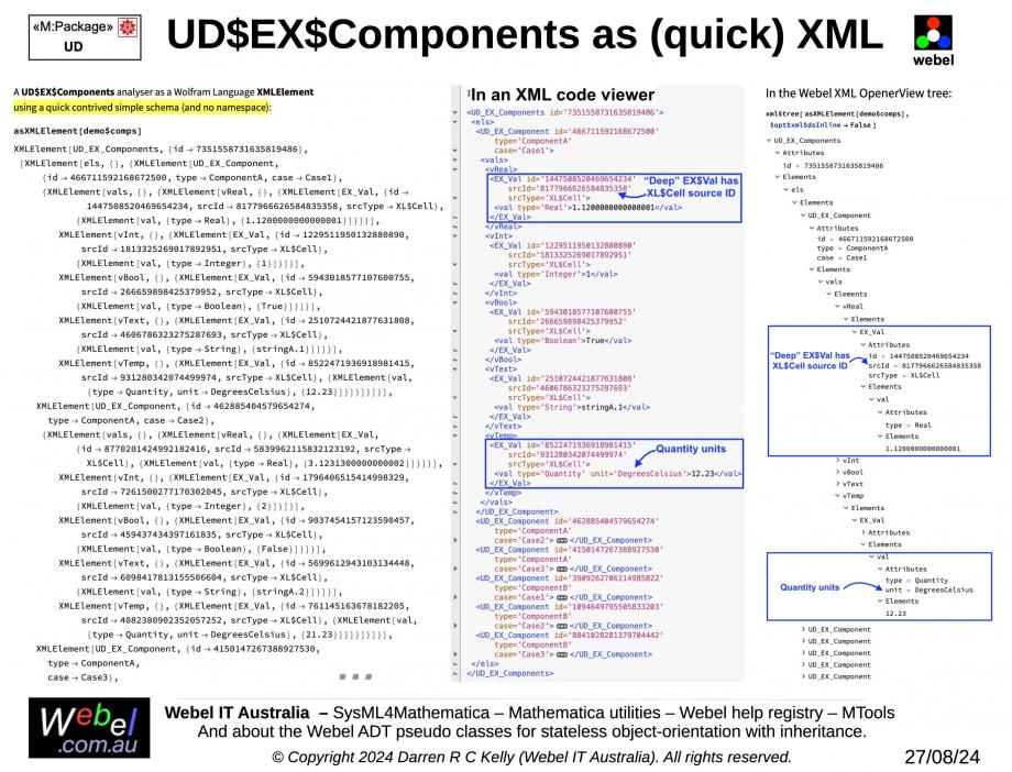 The Wolfram Language is particularly well suited to working with XML. The quick contrived XML "schema" as shown in the slide for the UD$EX$Components analyser (an ADT$List extension with UD$EX$Component items) took only about ten minutes to create (and some time preparing the slide presentation).