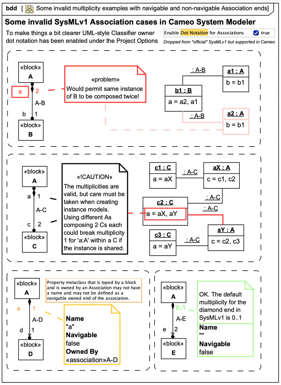 Finally, the 4th case (lower right A-E) shows a valid case with the default SysMLv1 multiplicities for the diamond end explicitly provided:
