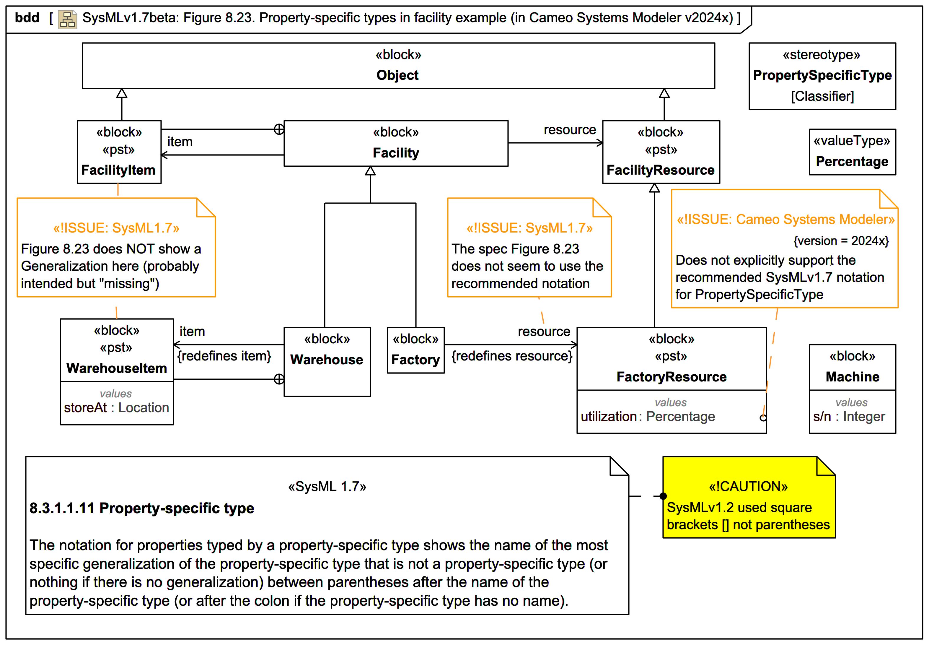 Neither the SysMLv1.7 Figure 8.23. Property-specific types in facility example nor Figure 8.24. Changes in classification over time due to property-specific types seem to use the recommended notation.