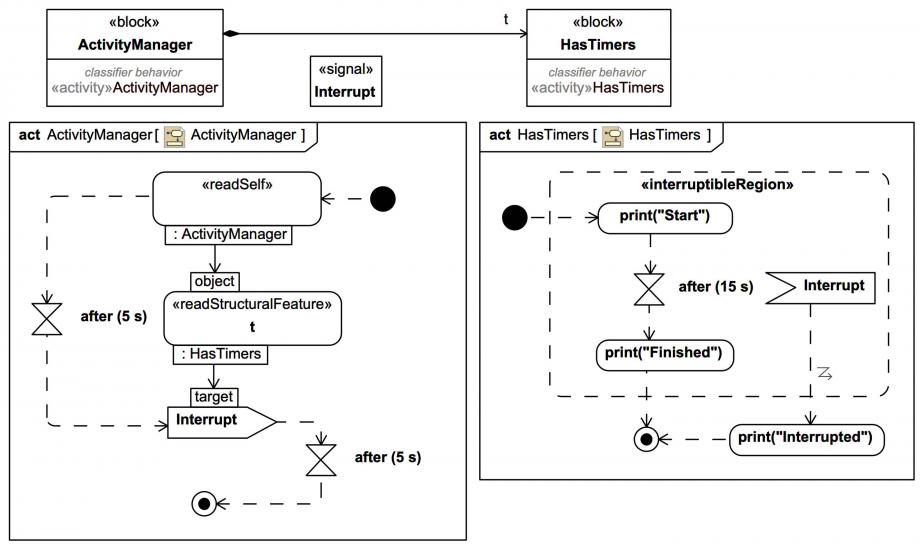 An Interrupt signal will be received before the OpaqueAction that prints “Finished” within the InterruptibleActivityRegion can be reached, and “Interrupted” will be printed instead.