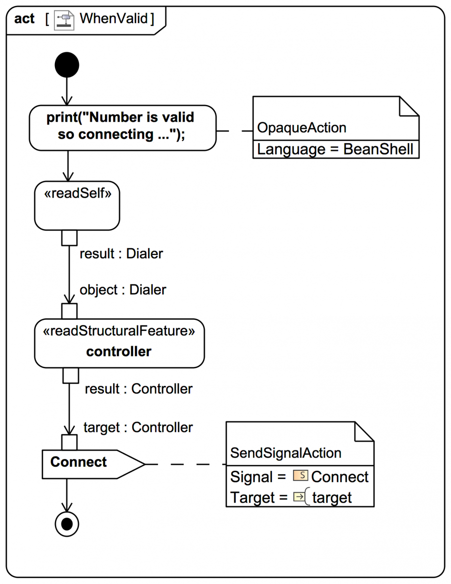 OK, we've come full circle. We've seen how Activities as entry, exit Behaviors on States and as effect Behaviors on Transitions work to bring StateMachines to life, and on the way we've also learnt some of the basic principles of using Activities to invoke Operations, to send and receive Signals, and to coordinate behavior.
