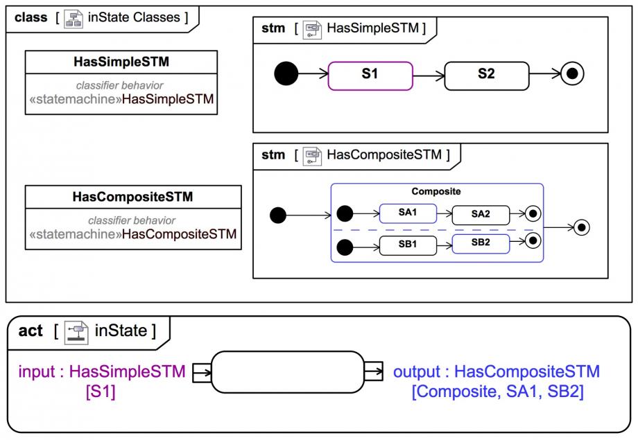 ObjectNodes may also specify an inState set of States. If such a set is specified, then any object token held by the ObjectNode shall have a value with a type that has or inherits a StateMachine as its classifierBehavior that has all of the states in the inState set, and whose instance for the given value shall be in a state configuration containing all of the States specified in the inState set