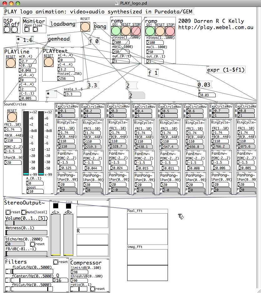 There are 8 sound channels, corresponding to each of the 8 circles in the logo. In addition, there are some pragmatic controls for visual elements such as the width of the "disc circles" and the scale of the visuals, and global audio controls. There are two ramps, the first is used to drive the sound swell and the brightening of the line and 8 circles, the second is used to brighten the 'PLAY' text and fade out the entire sound. And there is a stereo output block with some echo and feedback FX, a compressor, and some audio monitors, as well as a Fourier analysis block.