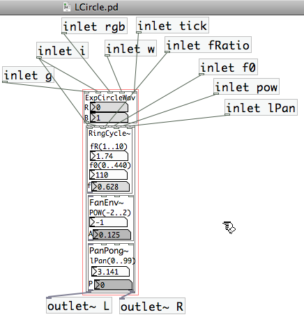 Each "logo circle/ring" controls not only a disc circle (inside an "expanding circle wave"), it also controls a "circle sound"; this strong binding of the visual elements to a specific aural interpretation - which would otherwise be discouraged on IT design pattern grounds - is deliberate here, since the logo is conceived specifically to represent expanding and evolving sound waves. The visual brightness 0..1 is driving the audio channel !