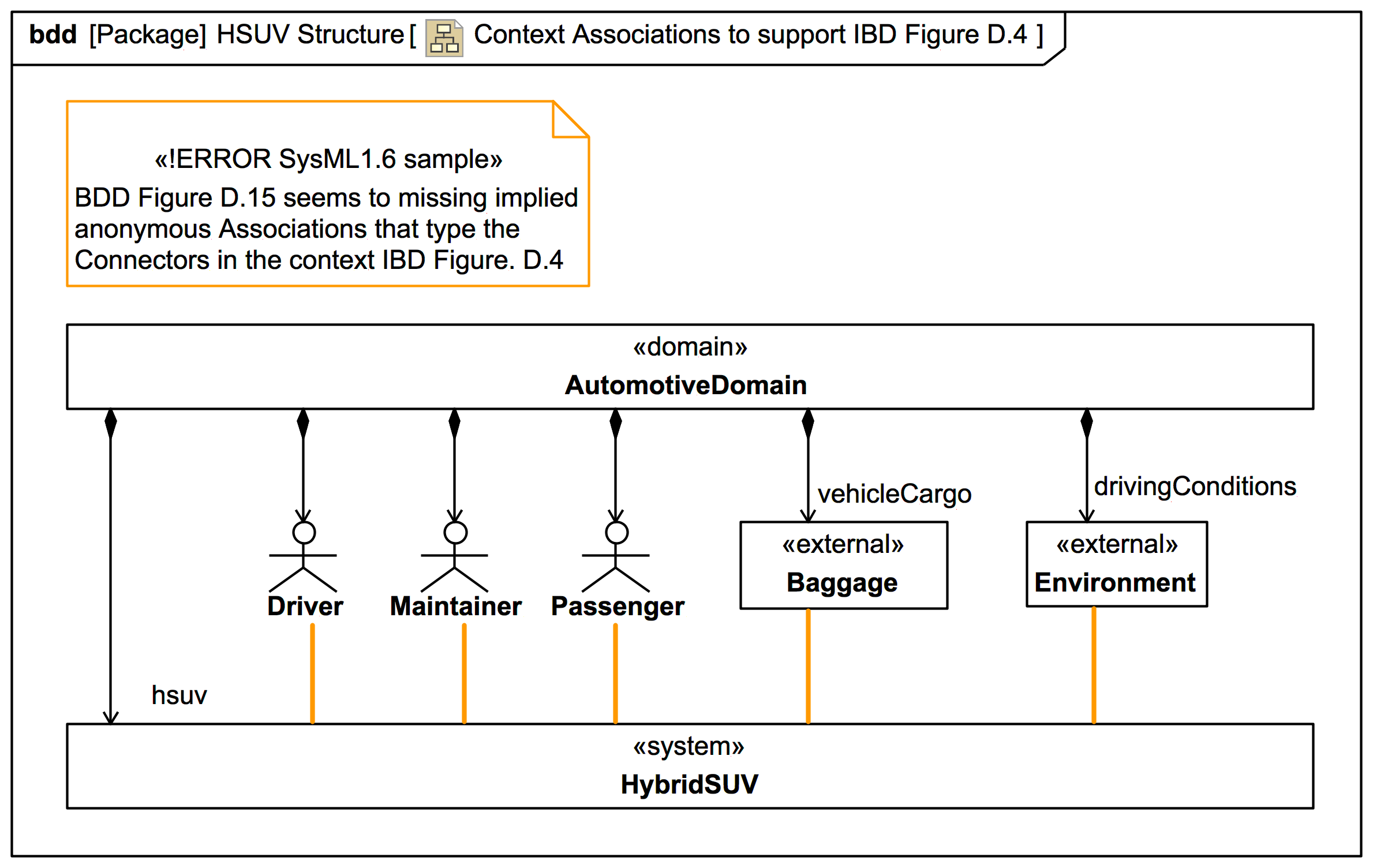 SysML-1.6: For the Connectors in Figure D.4 to be typed by the implied anonymous Associations need define them in Figure D.15 (or elsewhere) between 'HybridSUV' and: 'Driver', 'Maintainer', 'Passenger', 'Baggage', 'Environment'.