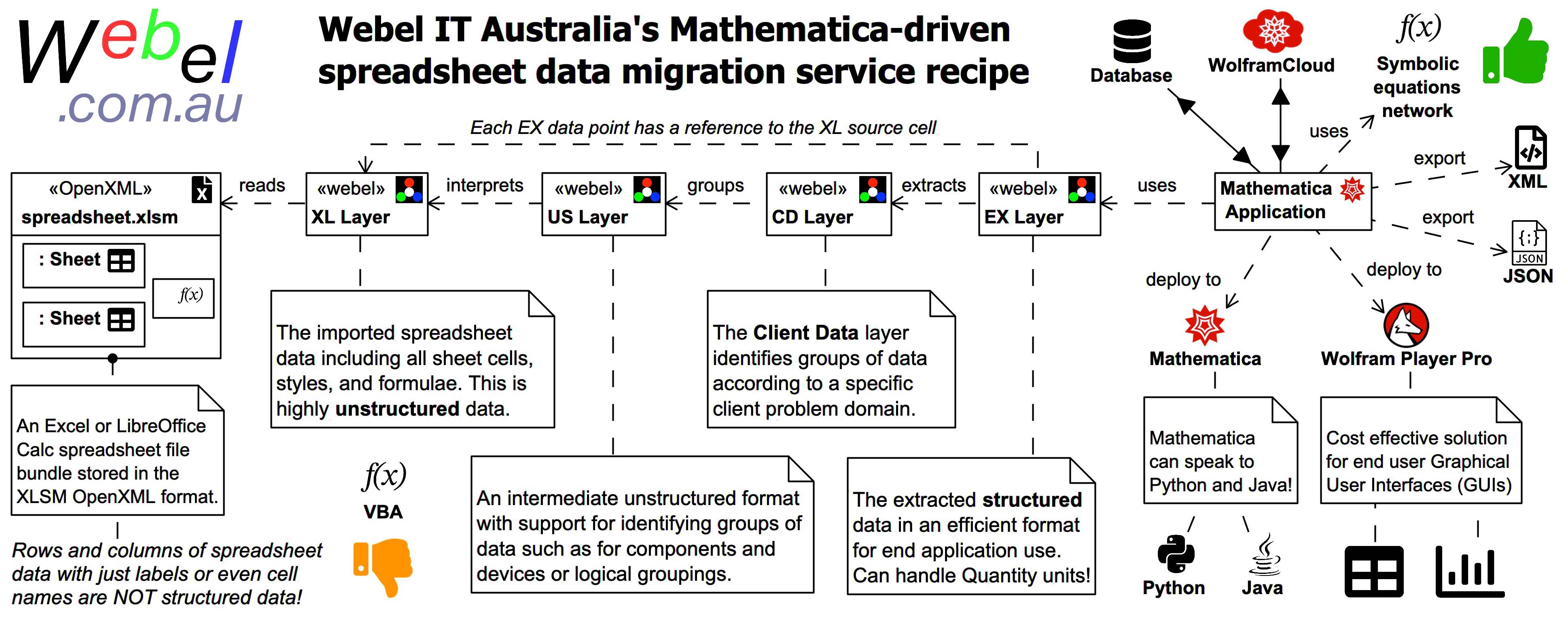 Do you have have "siloed" data and VBA formulae and macros stuck in old spreadsheet files from Excel or LibreOffice Calc? Webel IT Australia has the ultimate data and equation migration solution using custom Wolfram Mathematica libraries that have been employed on substantial engineering spreadsheets for previous clients.