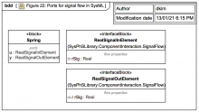 Figure 22 shows an example signal flow application. The block Spring has two ports u and y, of type RealInSignalElement and RealOutSignalElement from the signal flow library ..., respectively. Source SysPhS-1.1