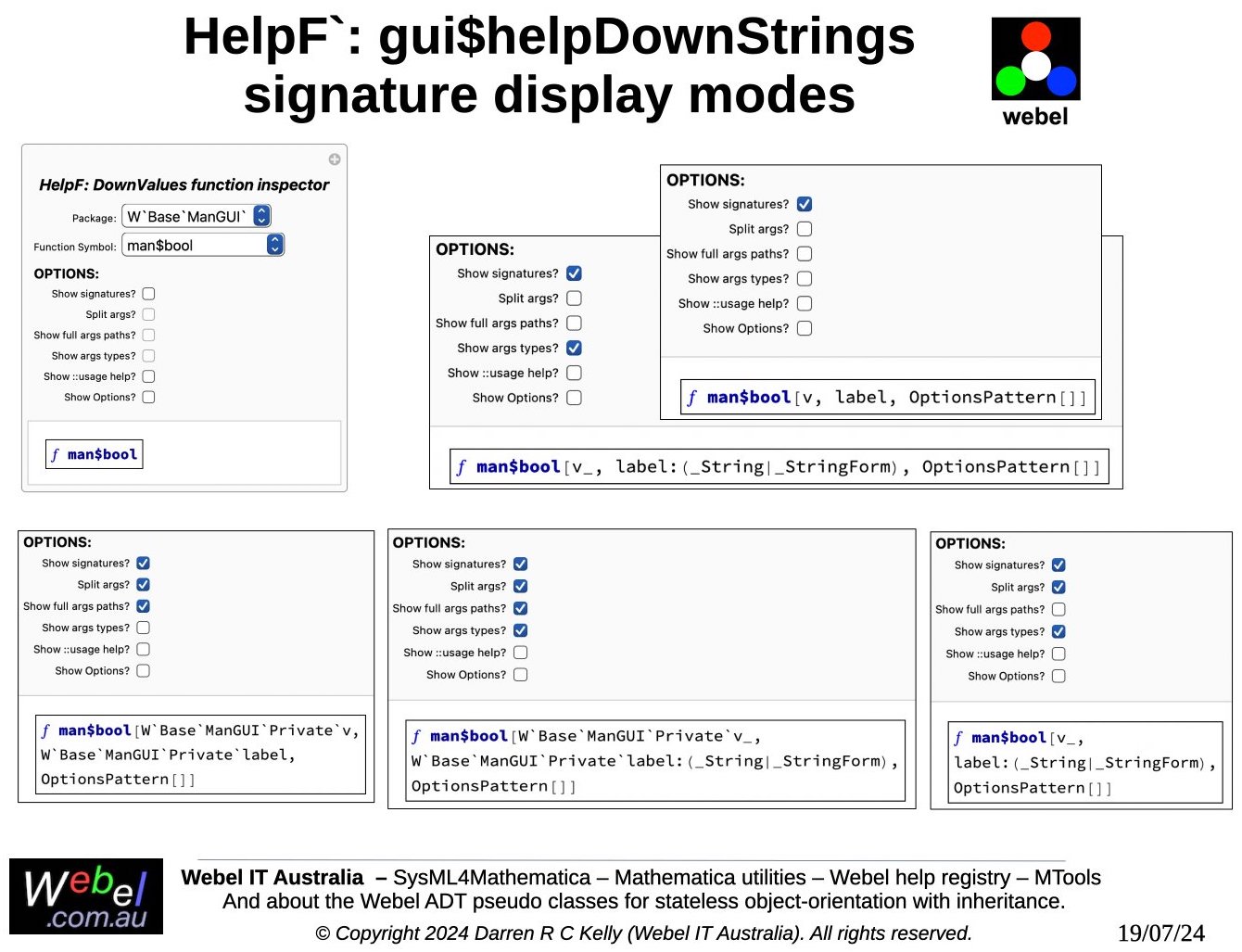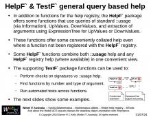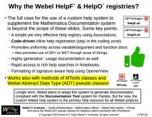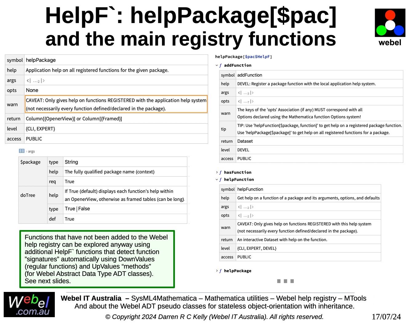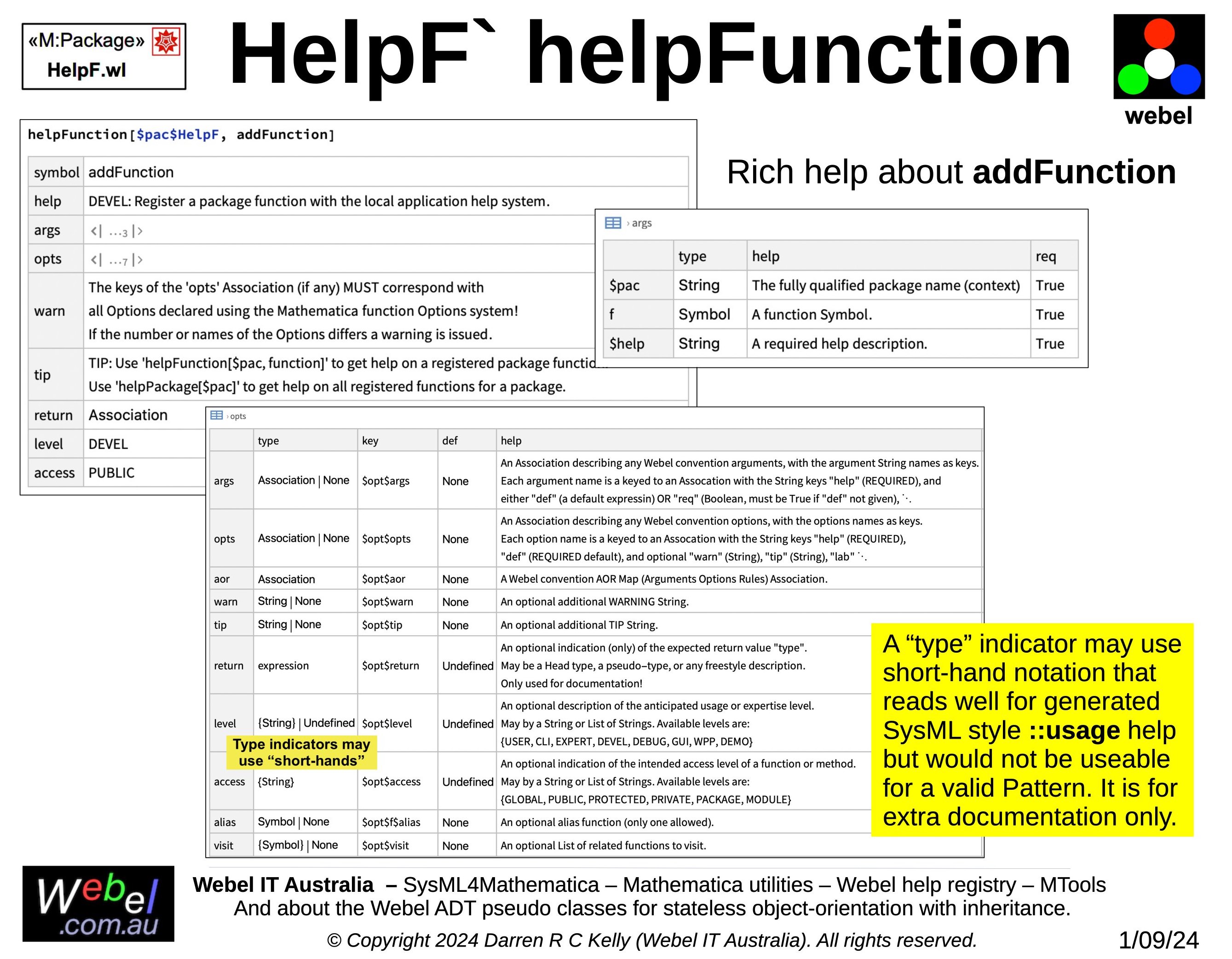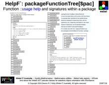HelpF` A Wolfram Language package within the Webel libraries for Mathematica. Manages a help registry for functions and their arguments and options. For a full description visit this detailed slide trail: