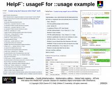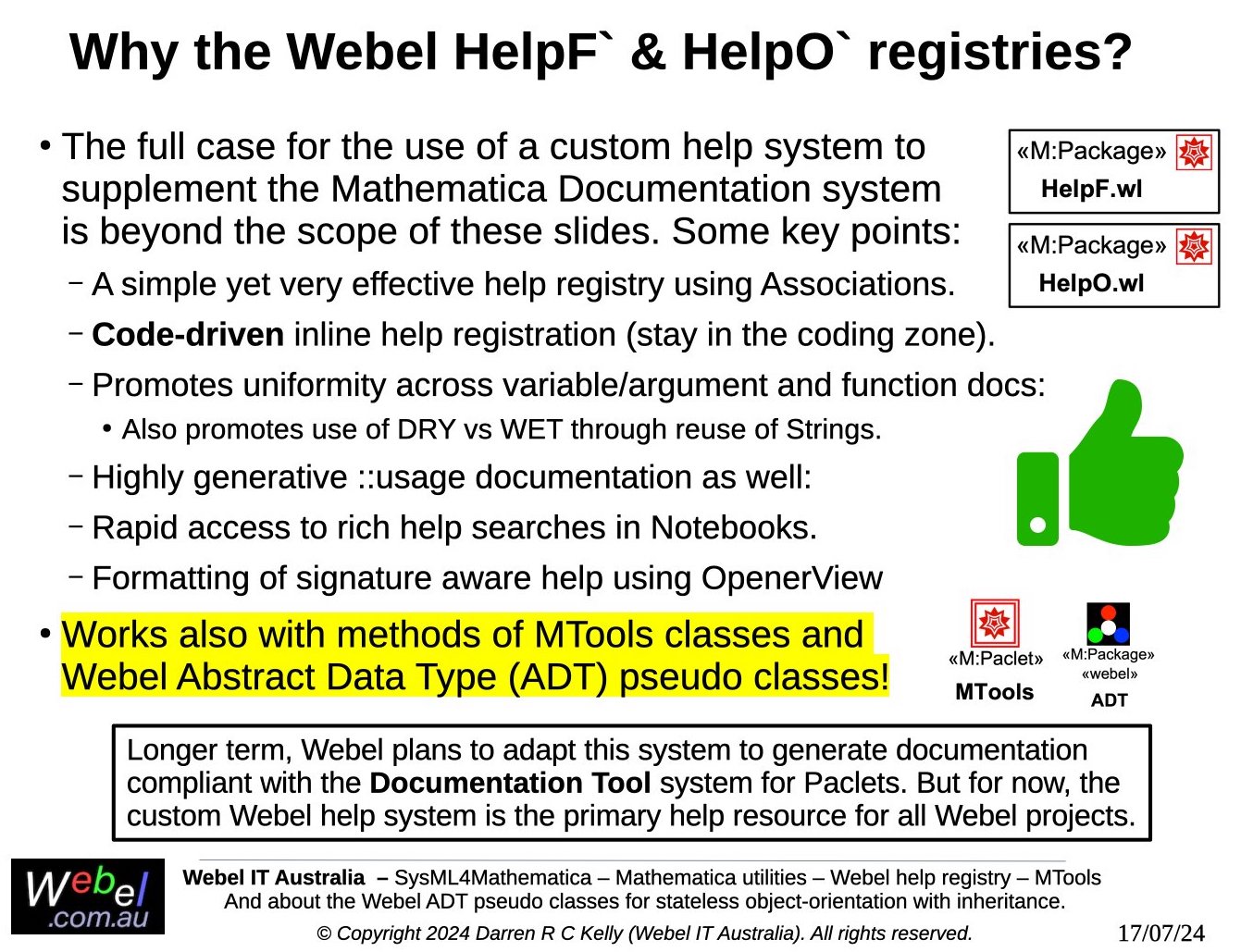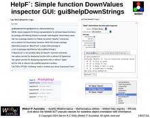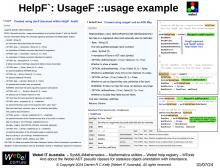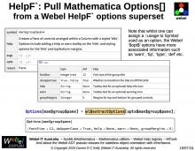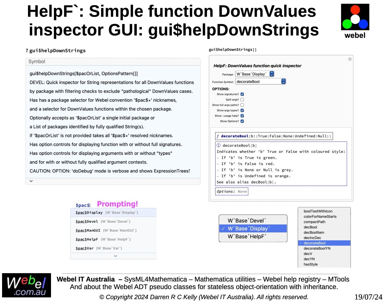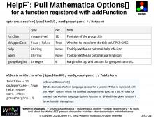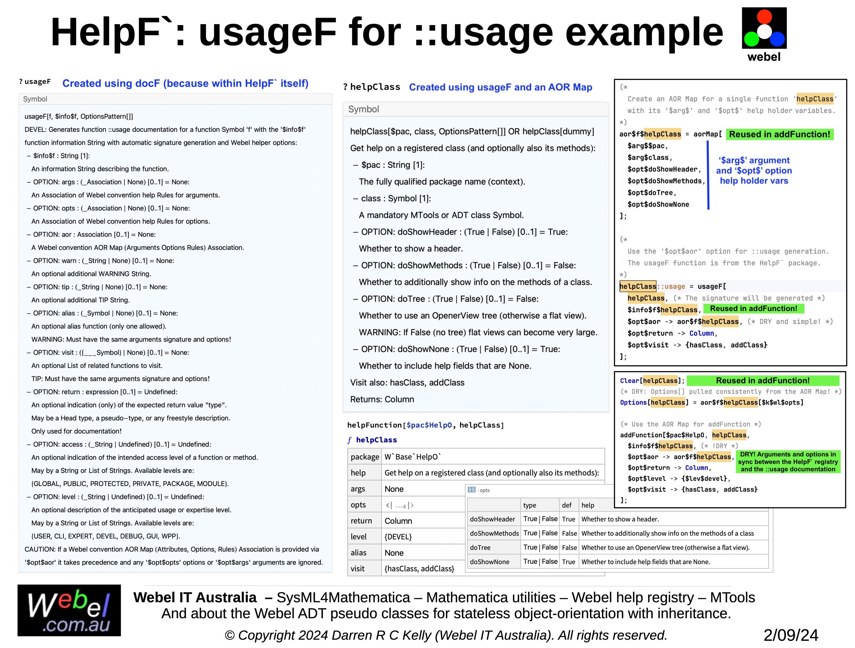 HelpF` A Wolfram Language package within the Webel libraries for Mathematica. Manages a help registry for functions and their arguments and options. For a full description visit this detailed slide trail:
