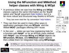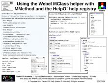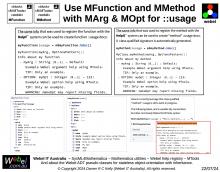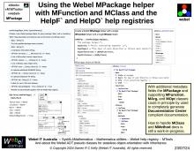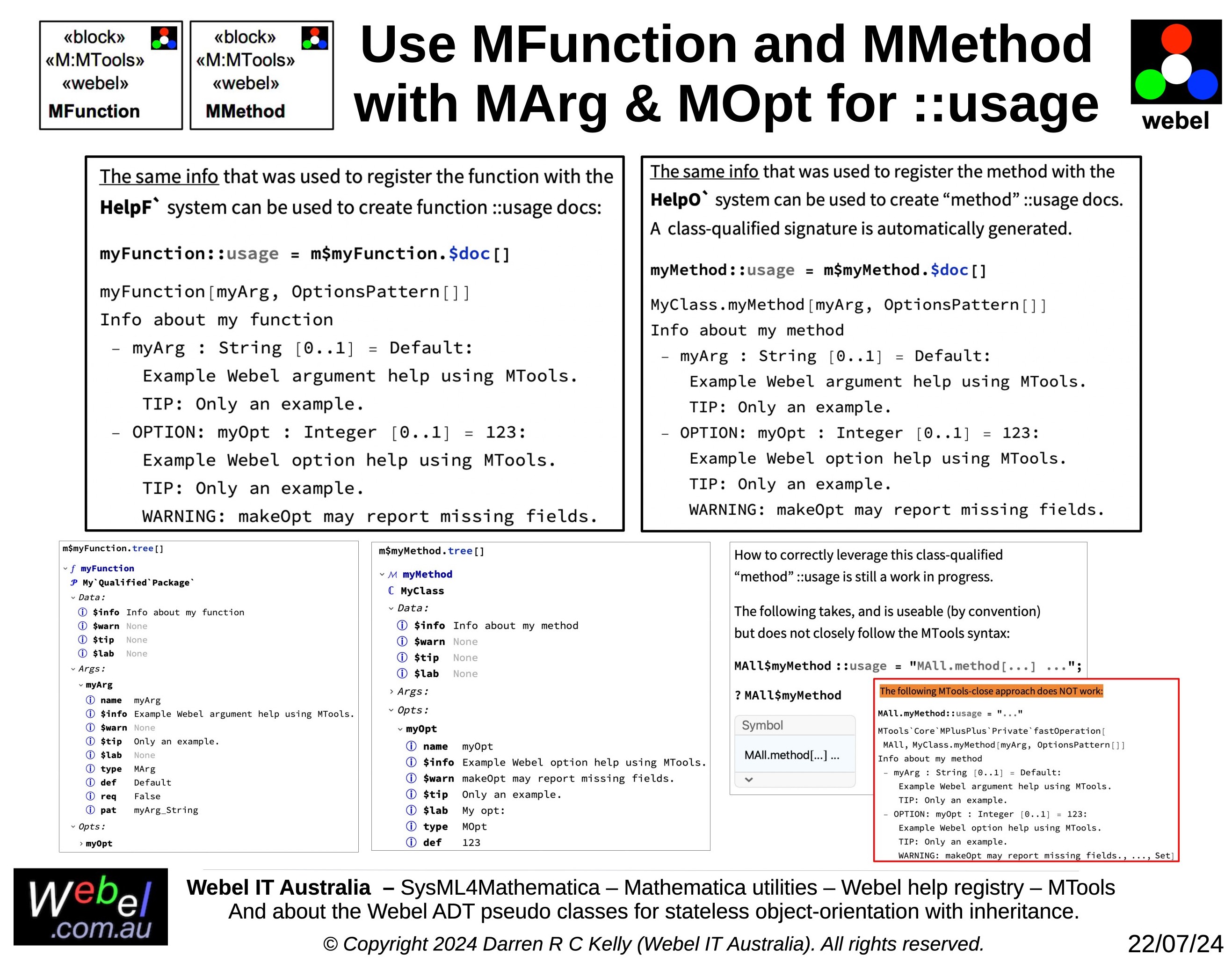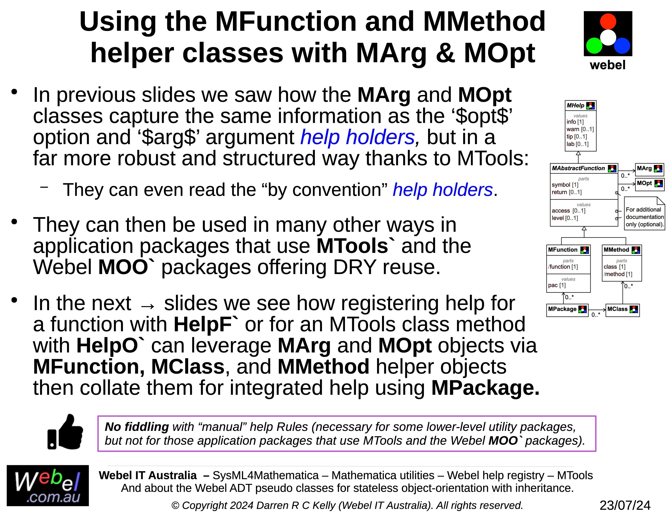 Mathematica: A Webel helper class for managing documentation for a method of an MTools class or a Webel Abstract Data Type (ADT) stateless pseudo class. Can carry MArg and MOpt objects. Integrates with the Doc` package for