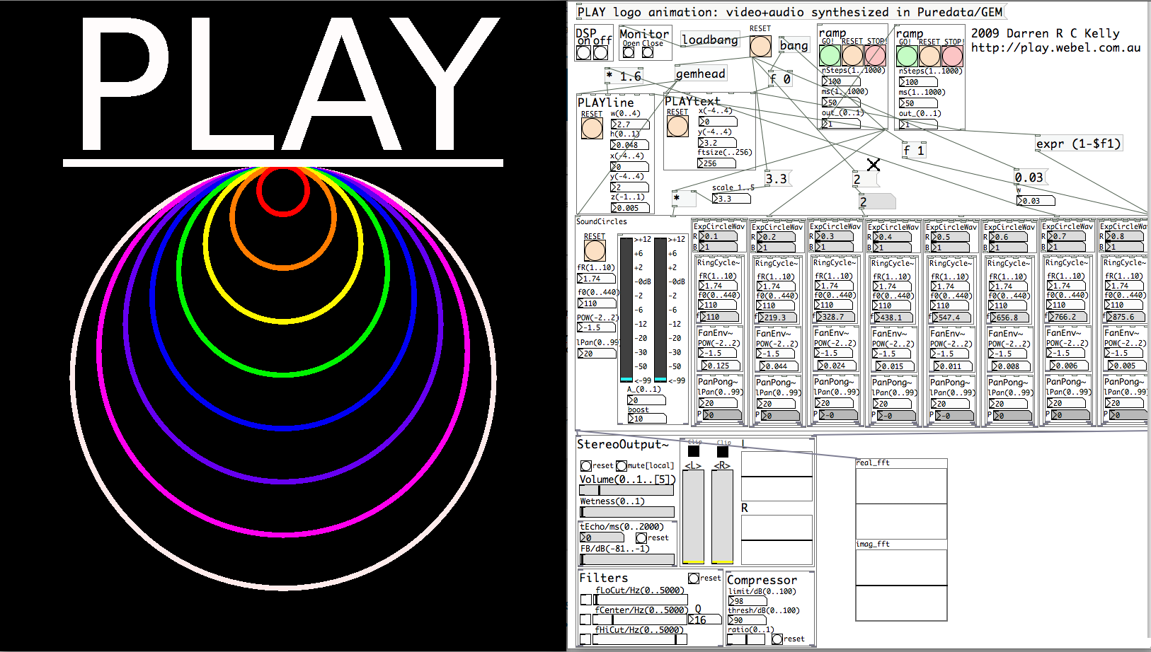 This version created using patch-based synthesis with PureData+GEM from around 2008 is now obsolete. For the latest version please visit: Video: The PLAYlogo synthesised light-sound circles