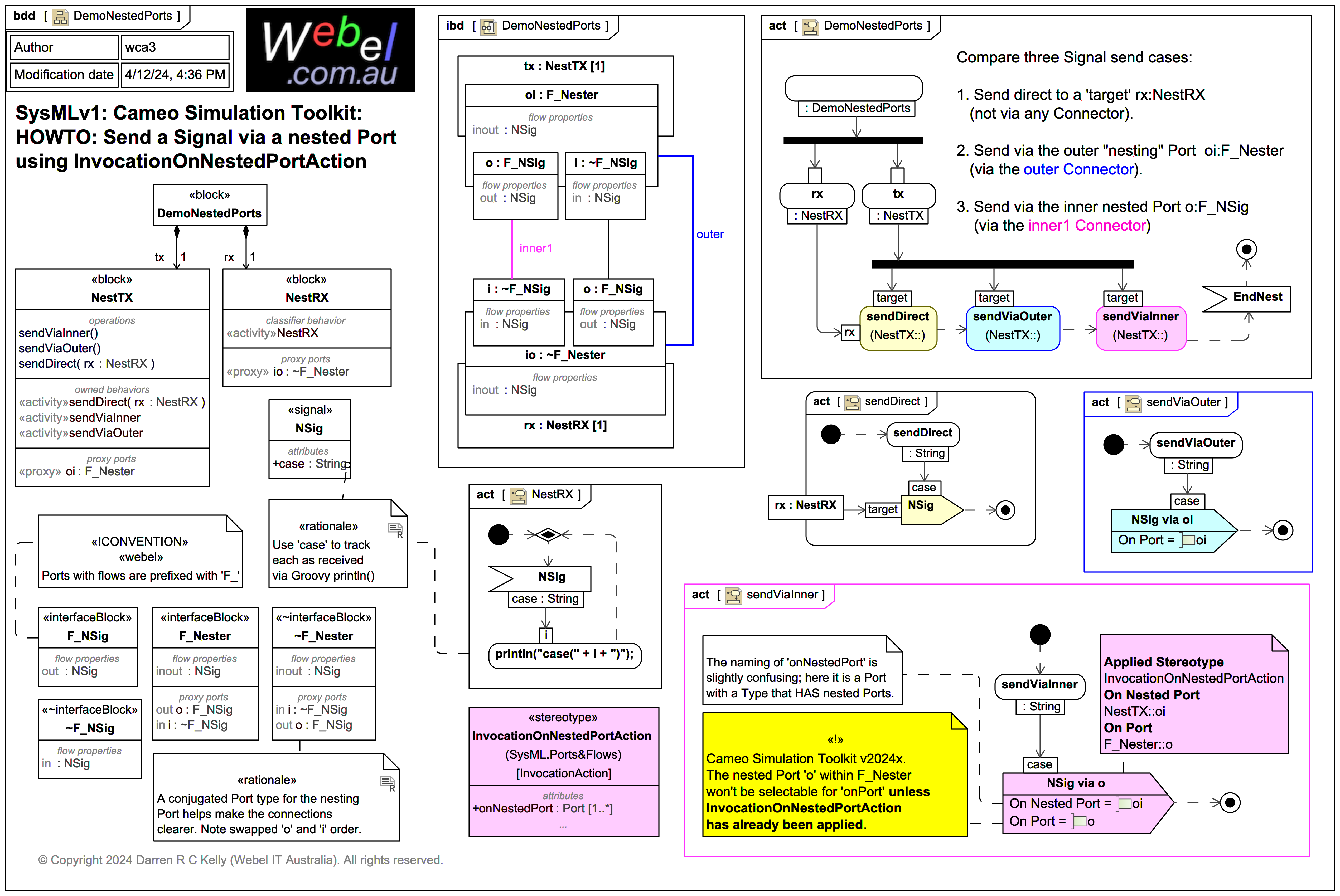 SysMLv1: Cameo Simulation Toolkit: Cases for Transitions triggered by Signals sent direct to a remote target vs via Ports [with mini video]