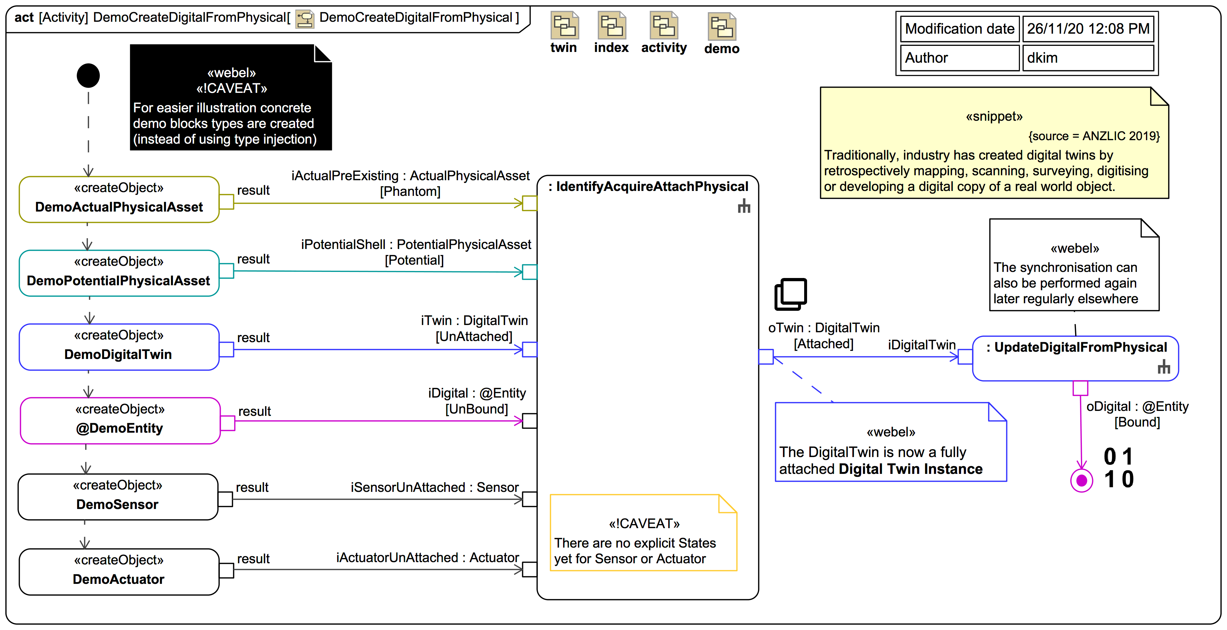 Screencast: The Webel Digital Twin Pattern for SysML: Part 1: Simulating acquisition or creation of physical assets using Activities and StateMachines in Cameo Simulation Toolkit.