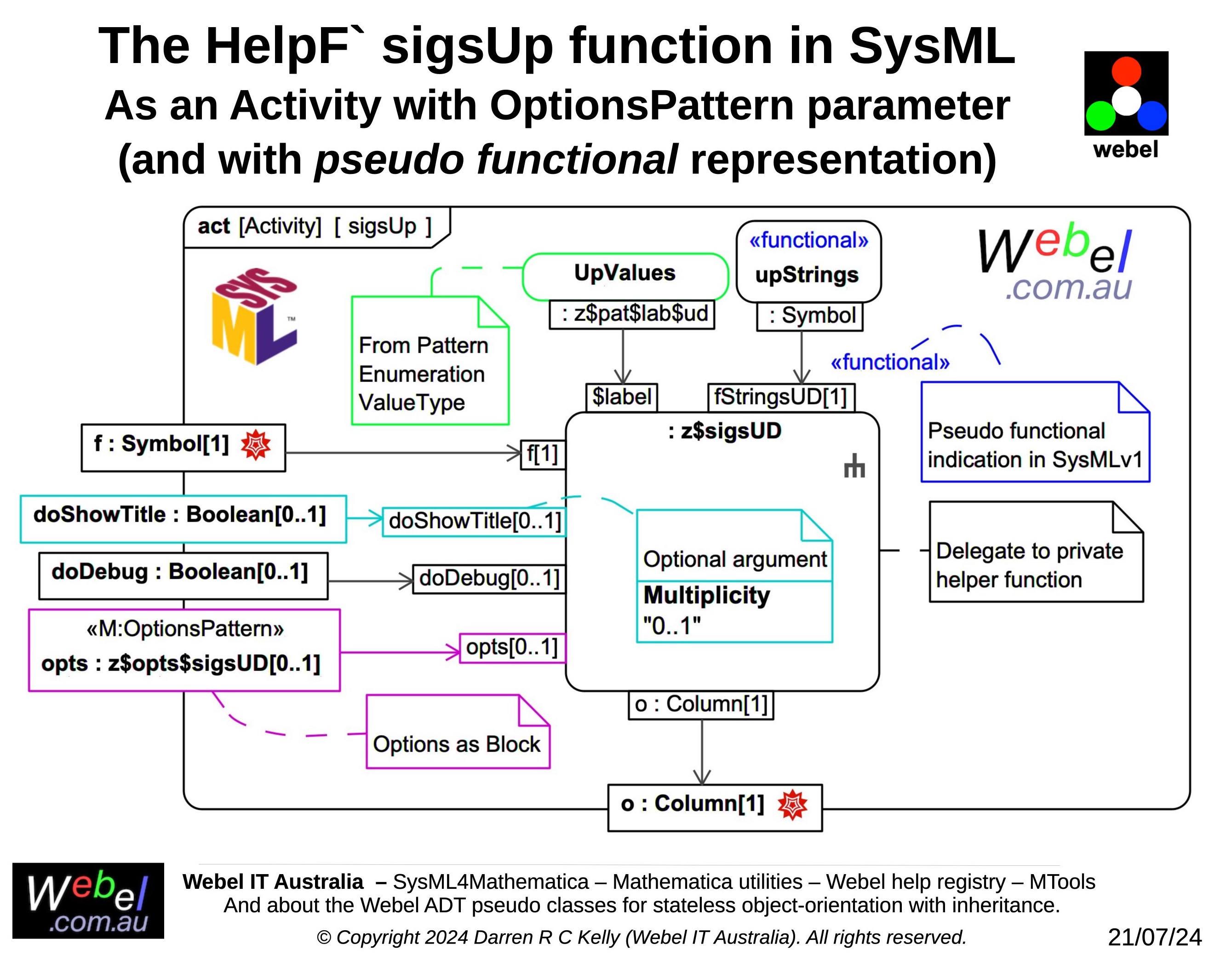 The sigsUp function with OptionsPattern modelled as a SysML Activity (and with "pseudo functional" representation)