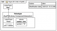 Figure 28 shows how a value type with units is defined in SysML, from the units library in Figure 20 [ERROR], Subclause 11.2.2 [ERROR]. It has a value type Force that specializes the Real value type and has newton as unit. The newton unit has a symbol N. Source SysPhS-1.1